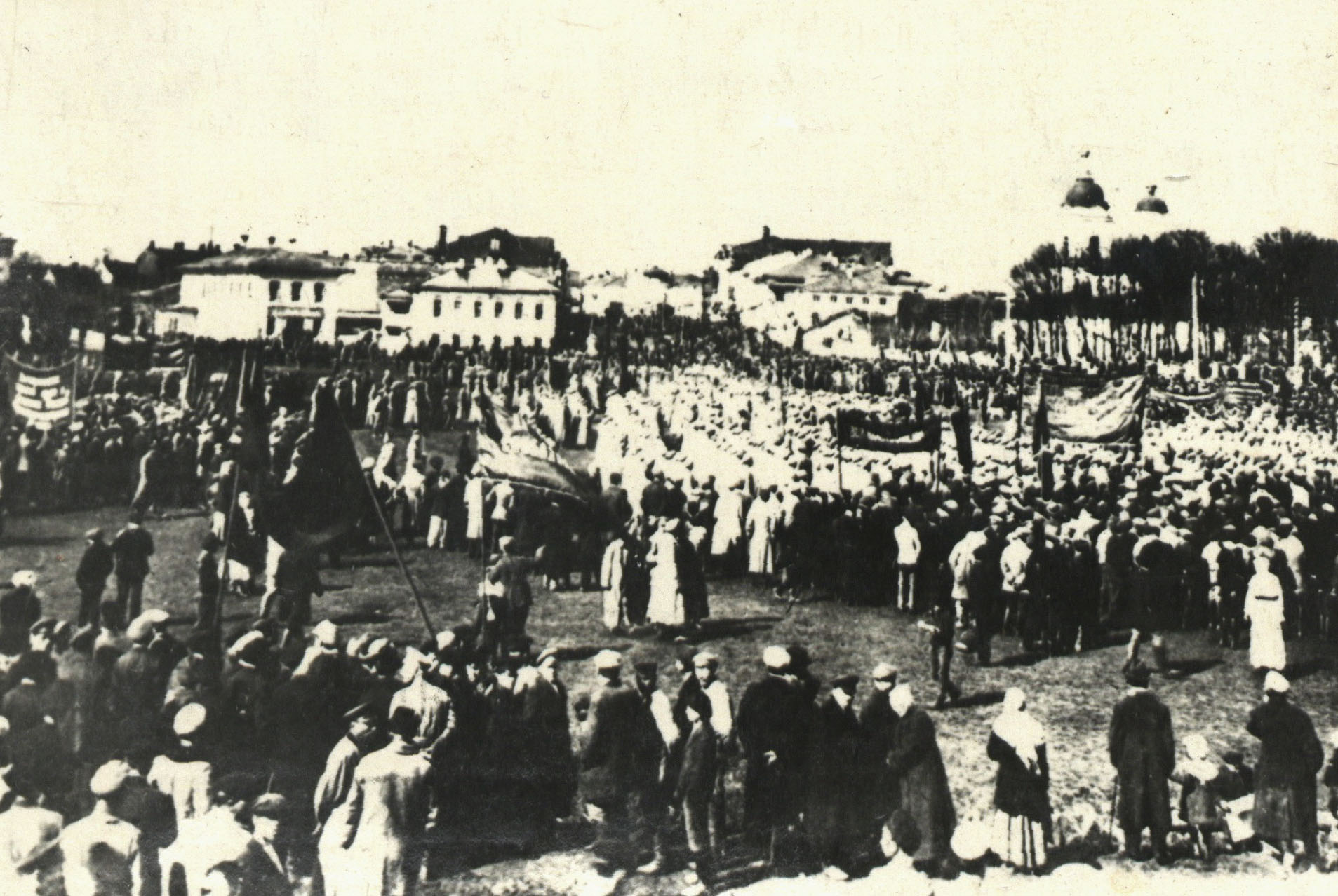 На первой фотографии запечатлена первая свободная демонстрация в честь Праздника труда в поселке Красавино Вологодской области в 1917 г. Только после Октябрьской революции День труда принял статус официального праздника. Как говорится в газете «Красный север» за 1920 год: «В 1917 г. окончательно проснулся пролетарий, отряхнулся, оправился и отпраздновал свой праздник первый раз свободно с первомайскими лозунгами, за которые по его спине ходили раньше плетки».