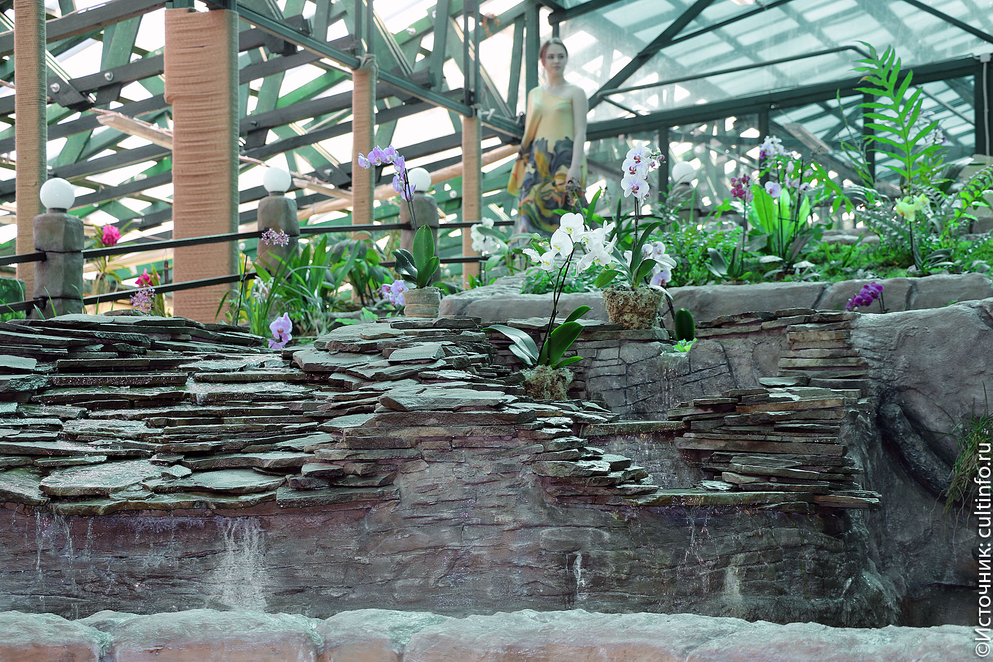 Музейная композиция интегрирована в сложный ландшафт с многочисленными живыми экспонатами. В ее основе – скальный остров высотой в два метра, с вершины которого открывается потрясающий вид. Подняться на вершину скалы можно по мощеной дорожке, которая пролегает между каскадом водоемов. На стенах размещены самые красивые и редкие виды орхидей.