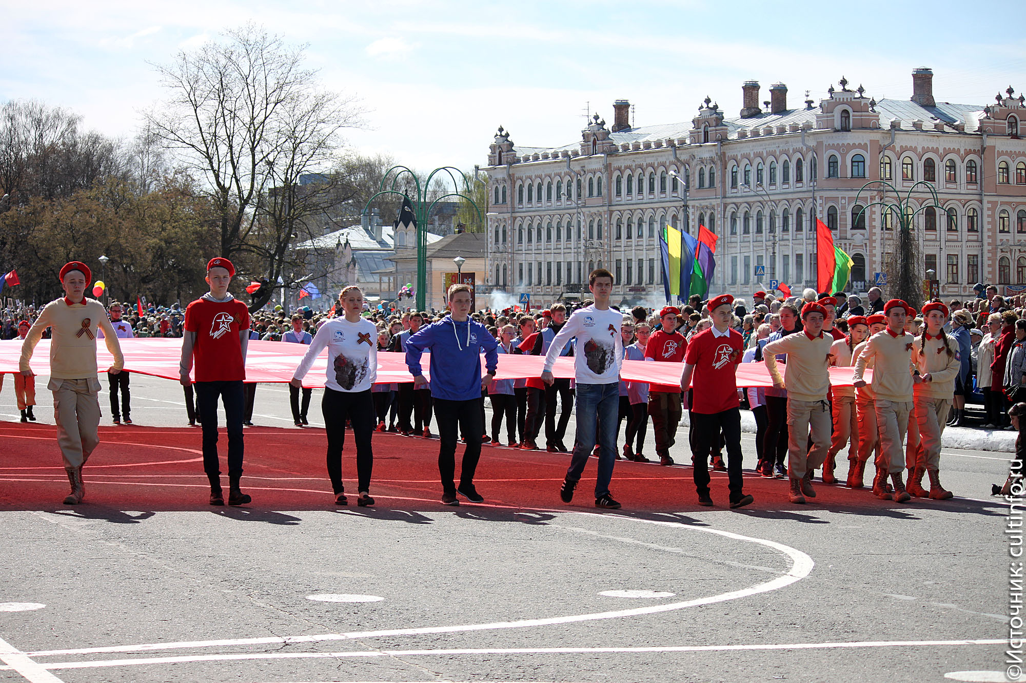 Более 60 волонтеров Победы, юнармейцев, участников поисковых и патриотических движений пронесли по площади увеличенную копию Знамени Победы. Общая площадь полотнища – около 200 квадратных метров. Впервые такая акция прошла весной 2016 года. По традиции легендарное полотнище проносят перед выходом колонны «Бессмертного полка», в которую в этом году встало свыше 8 000 вологжан.
