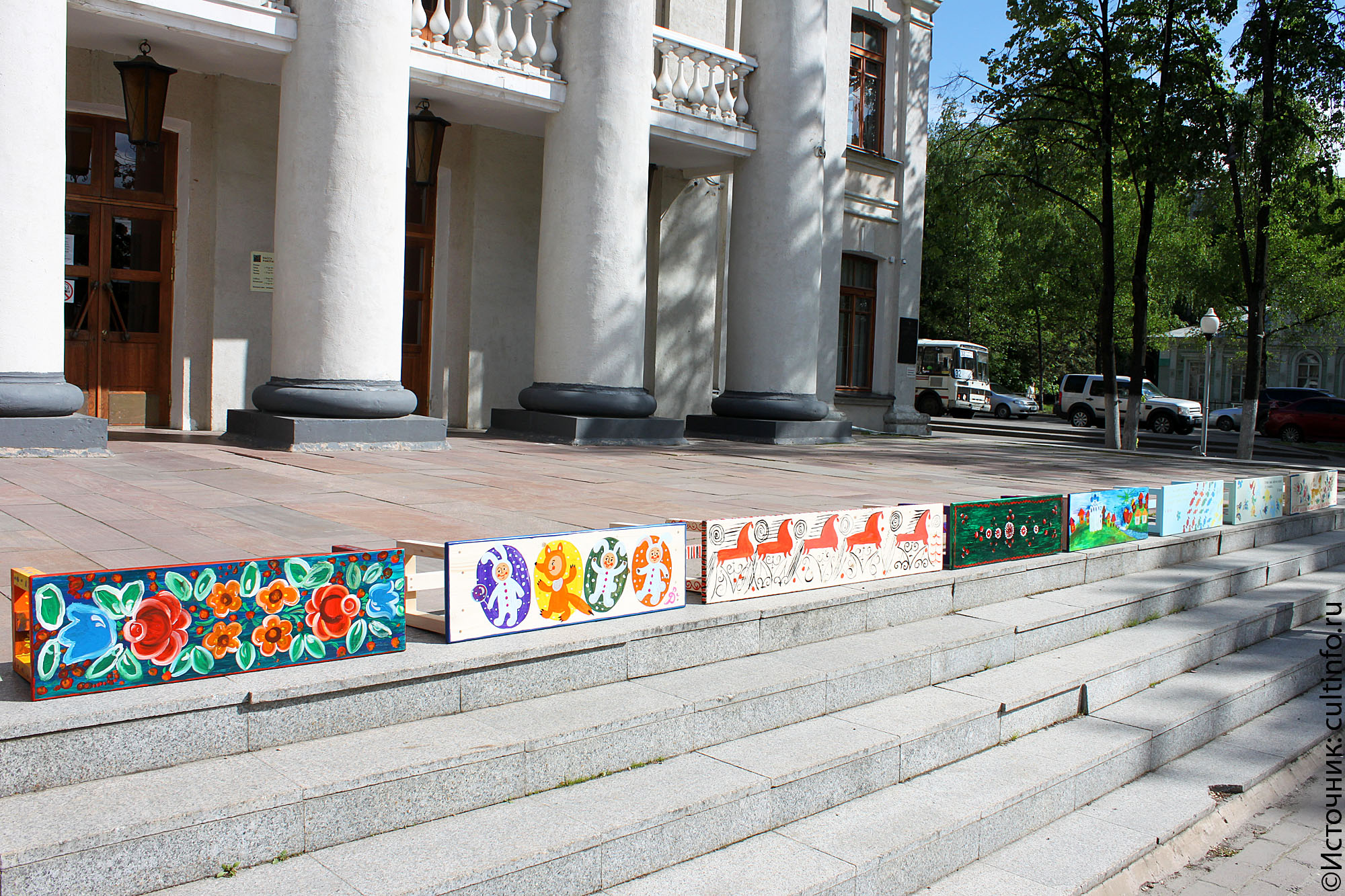 В результате появилась лавочка, оформленная мезенской росписью – знаменитыми красными конями, лавочки, расписанные в свободно-кистевой манере, несколько коллективных авторских работ. Нетрудно было узнать среди скамеек ту, что расписывала известная вологодская художница Вера Добрынинская, стиль и рука которой для многих узнаваемы.
