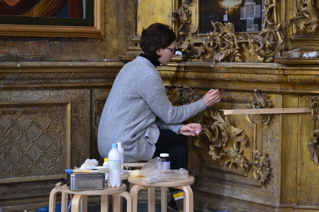 За время практики студентам предстоит кропотливая работа по консервации золоченой резьбы, удалению загрязнений, частичной реставрации объемных элементов.