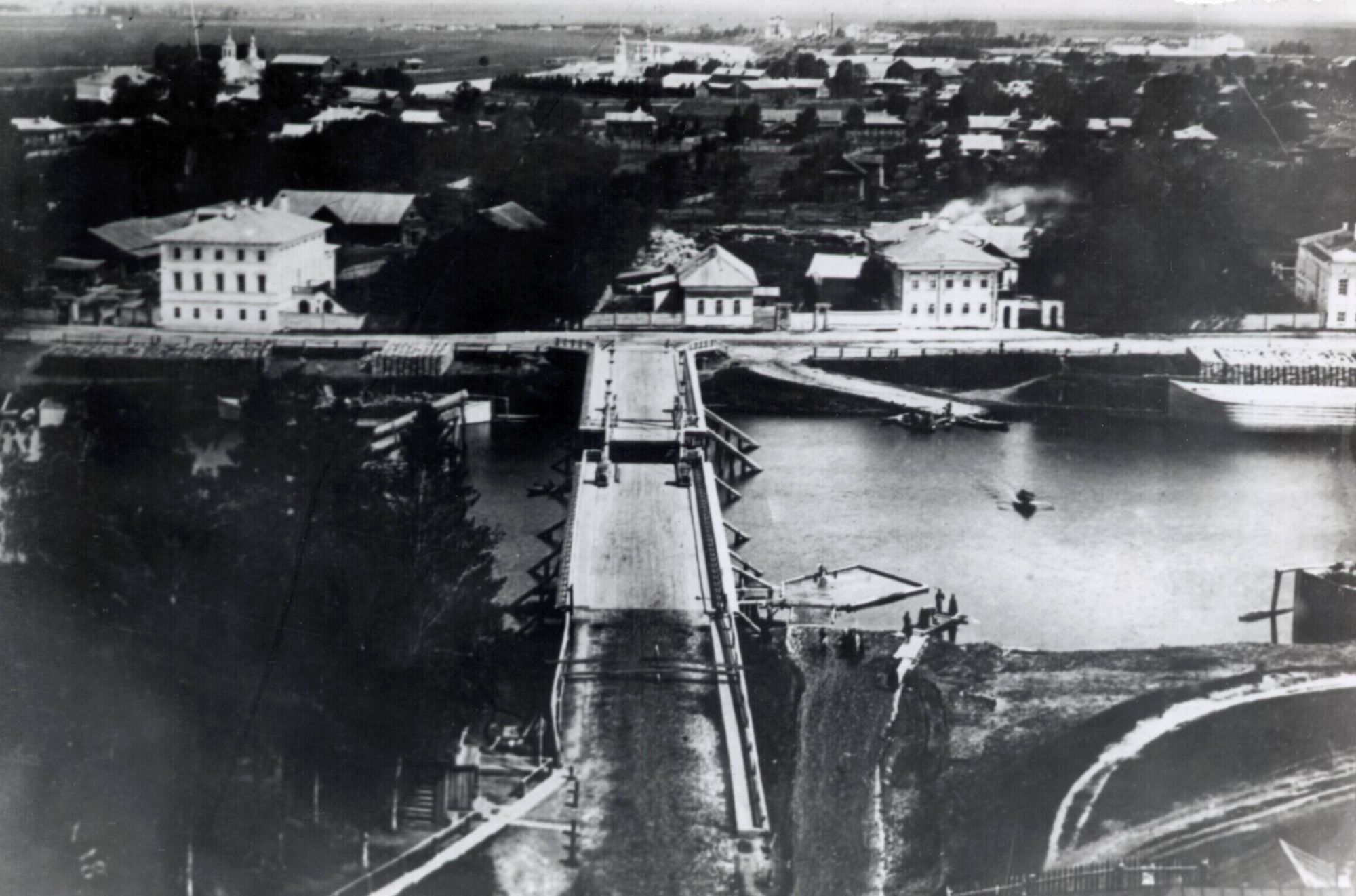 Государственный архив области представляет Ведомость о мостах Вологодской губернии за 1805 год, где имеются сведения о постройке в 1797 году «плавучего» деревянного моста «против Соборной церкви», который обошелся казне в 285 рублей. Соборный мост был построен по проекту инженер-майора Мрачковского и открыт 9 апреля 1847 года. Он был деревянный с подъемным устройством в среднем пролете для пропуска судов. На архивной фотографии можно увидеть, как выглядел Соборный мост в начале XX века (вид с колокольни Софийского собора). Он работал до 1896 года, затем начал ветшать, и встал вопрос о его замене – было принято решение перенести переправу на другое место. И в 1900 году против Большой Архангельской улицы (ныне Чернышевской) был построен деревянный Новый мост, который также называли Архангельским (на фотографии представлен Новый мост по окончании строительства). 29 июня 1901 года Новый мост был открыт для движения.