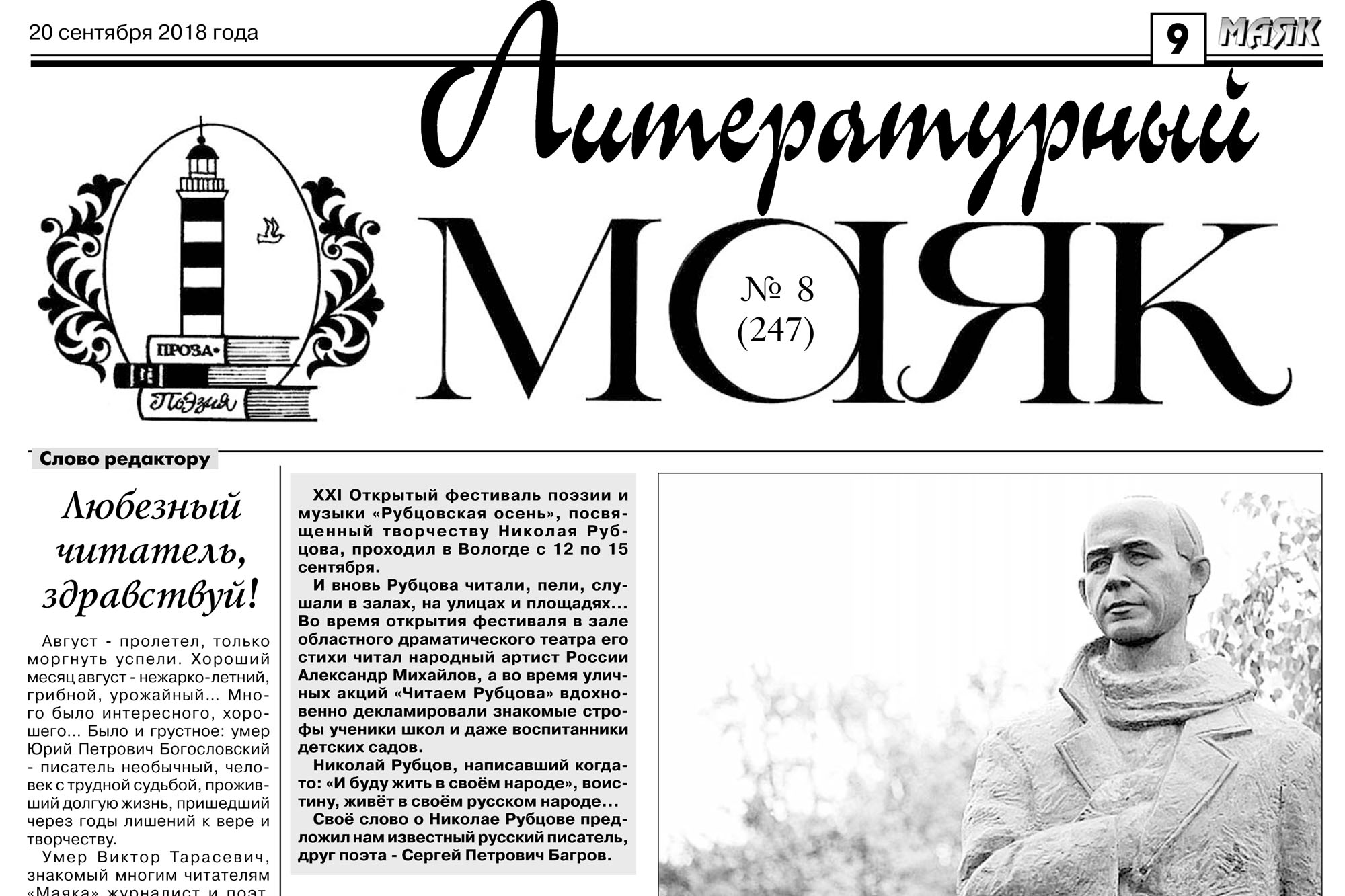 Главным на его страницах стал проходивший в Вологде в середине сентября фестиваль поэзии и музыки «Рубцовская осень». Открывает номер «Бескорыстный подарок» – слово вологодского писателя Сергея Багрова, друга Николая Рубцова. Сергей Петрович рассуждает о том, кем был Рубцов для современников и кем стал для всего русского народа в наши дни, нужно ли для того, чтобы понять поэта, причислять его к «течениям» и «школам» или достаточно внимательно читать его стихи…