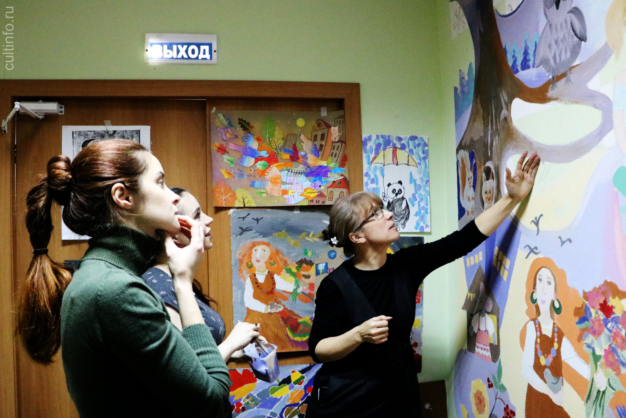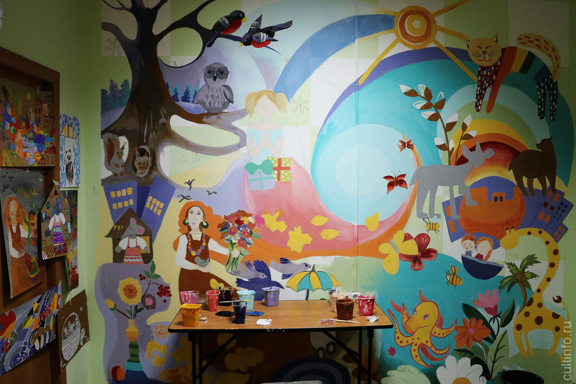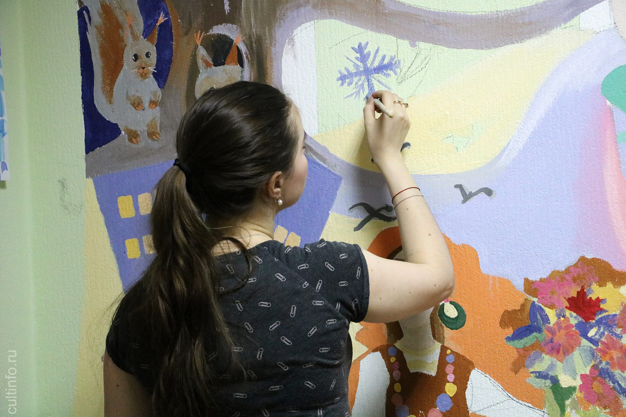 Часть стены расписали молодые преподаватели ДХШ имени Корбакова, вторую – финские художники вместе с учениками вологодской художественной школы в качестве мастер-класса по оформлению интерьеров учебного заведения.
