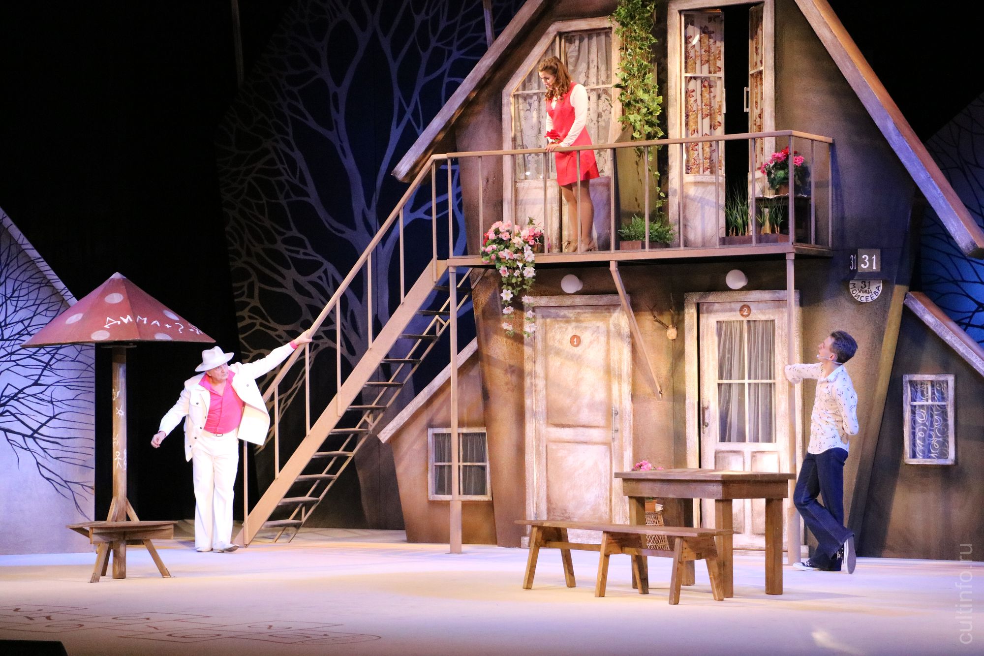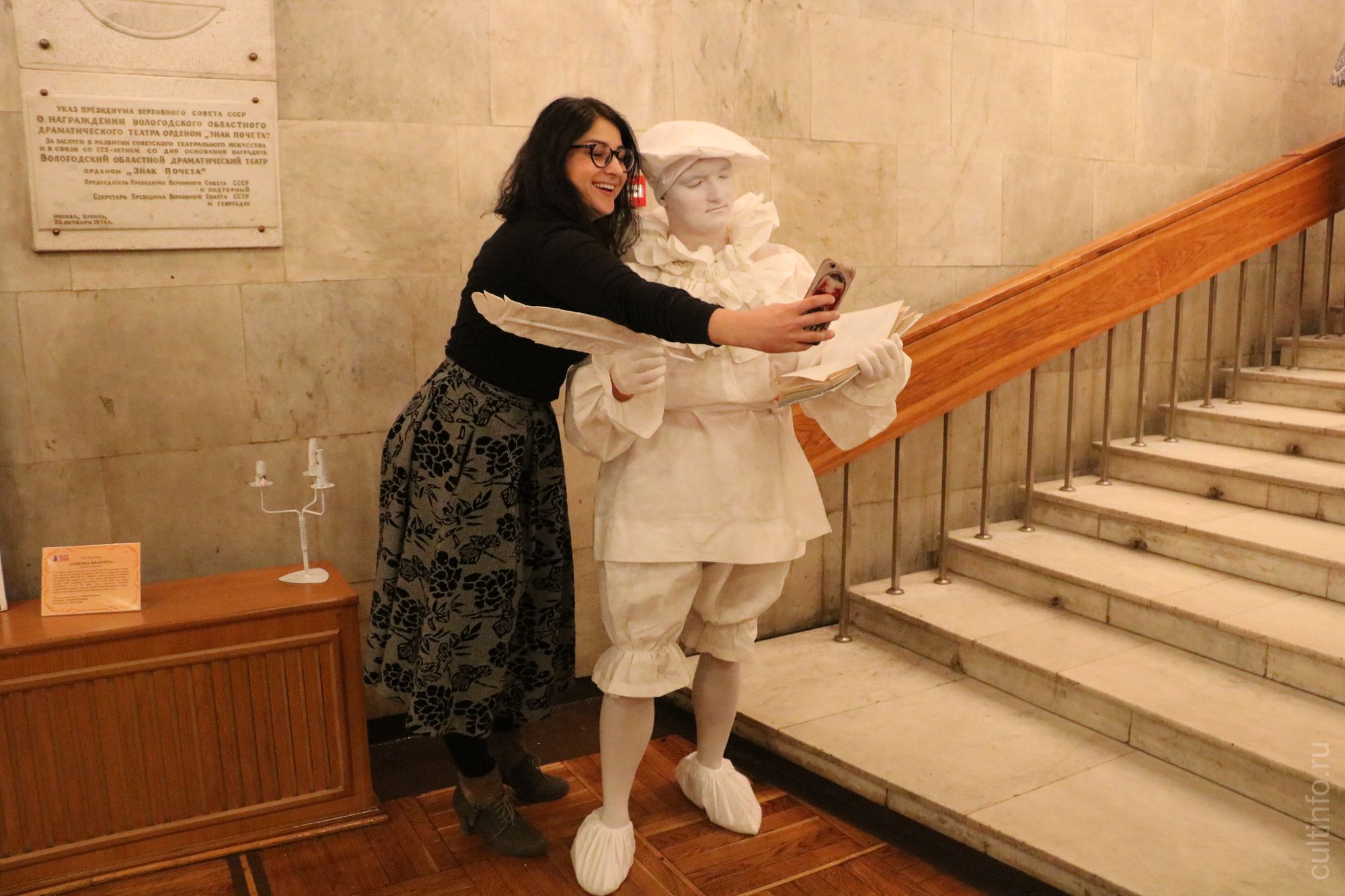 Театр в этот раз действительно начинался с вешалки: в фойе играл духовой оркестр «Классик-модерн бенд», на втором этаже бард Владимир Сергеев исполнял романсы, среди зрителей прохаживались юноши и девушки в вологодских кружевах, тут и там мелькали «живые скульптуры», с которыми пришедшие в театр поклонники драматического искусства охотно фотографировались.
