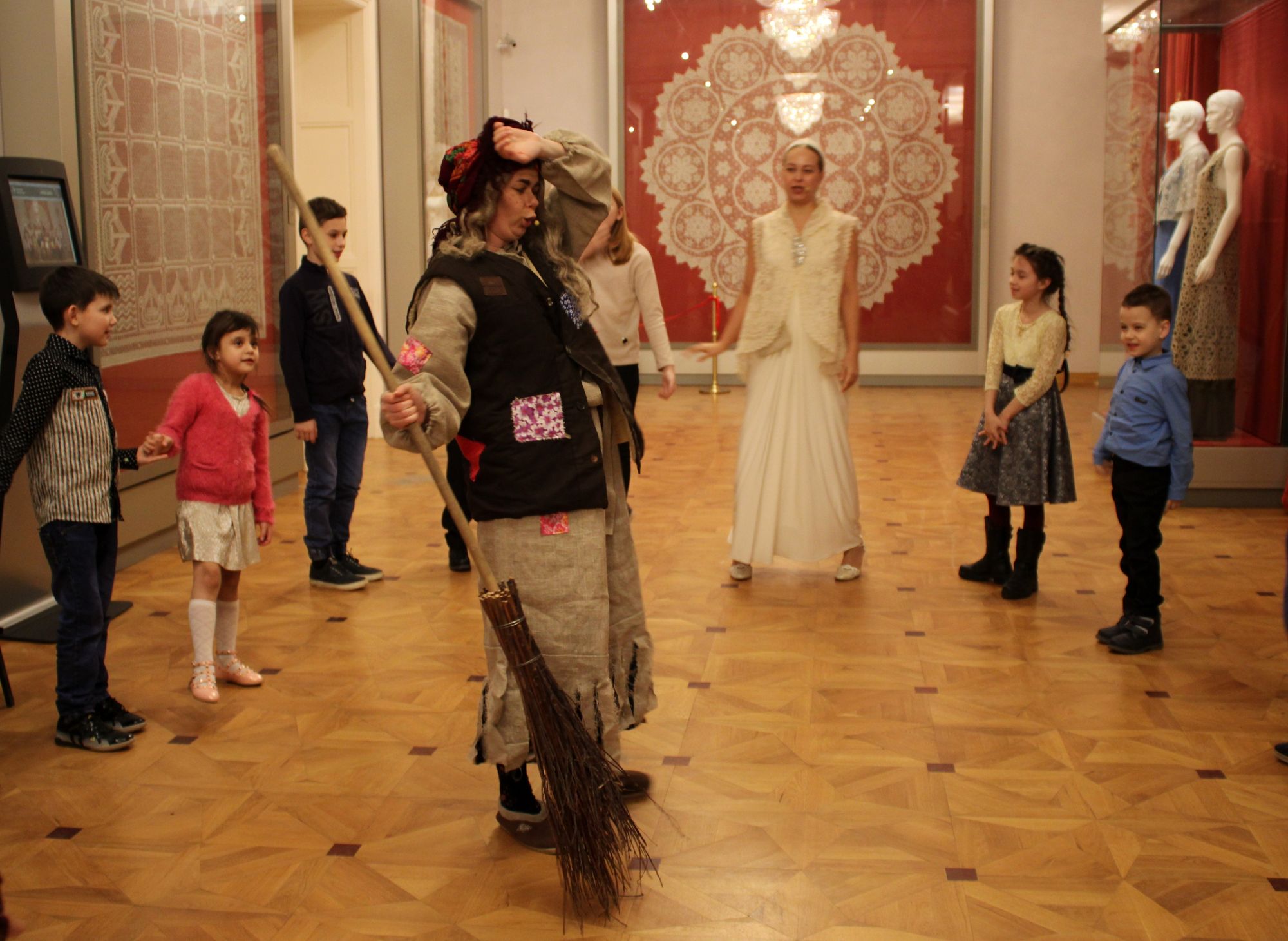 Вместе с Кружевницей и Метелицей – главными персонажами новогодней программы – ребята нашли самую большую снежинку в экспозиции, рассмотрели необычную ёлку с кружевами и собрались звать Деда Мороза со Снегурочкой... Но их планам помешала Баба-яга, которая решила испортить праздник. Детям пришлось разгадать зимние загадки, помочь мастерице с коклюшками и провести небольшое кружевное дефиле, чтобы показать старухе силу кружевного волшебства. Подобревшая Баба-яга помогла найти зимнего волшебника и его внучку. После весёлых игр, танцев и выступлений со стихотворениями Дед Мороз вручил всем ребятам по большому сладкому подарку.