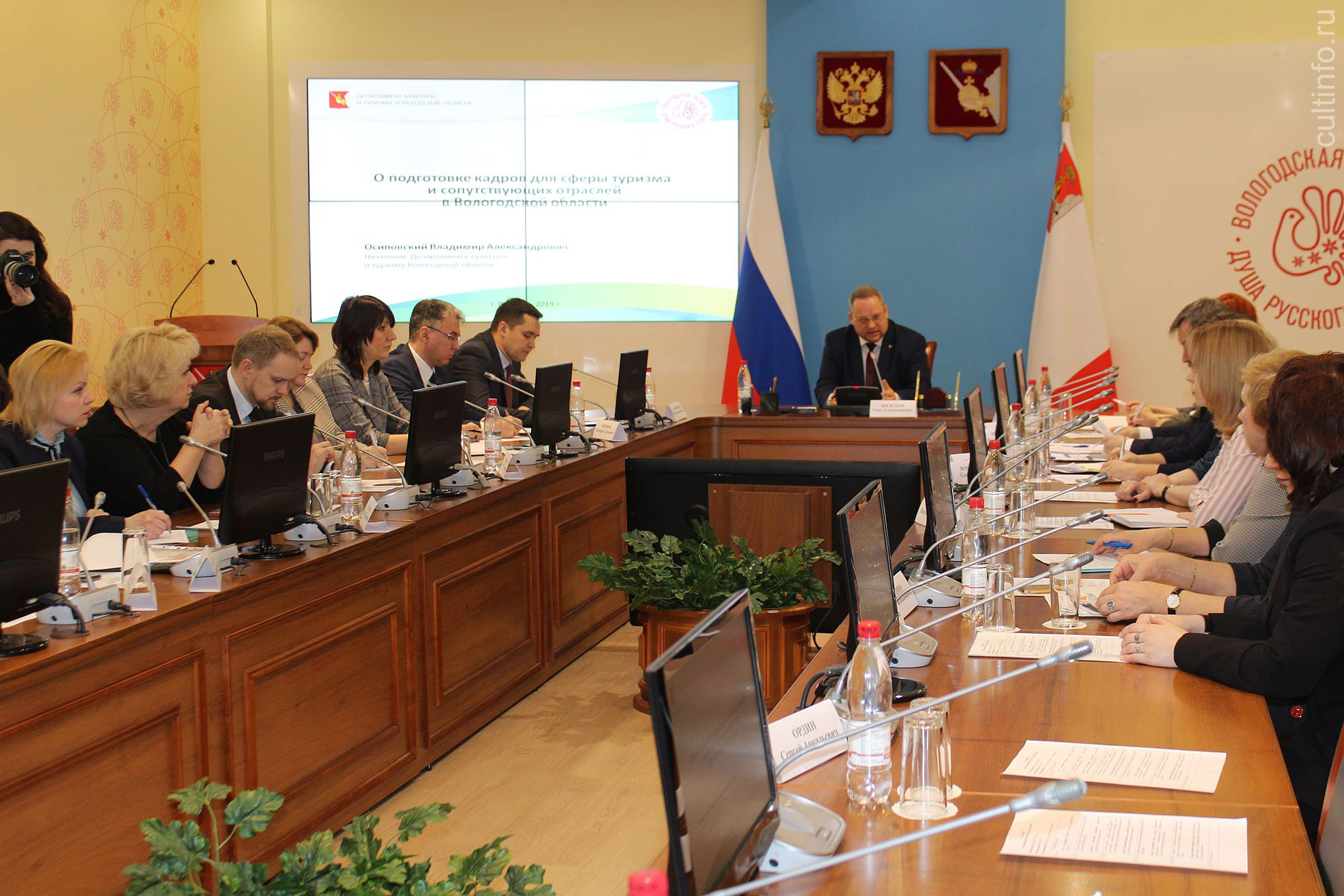 О системе профессионального обучения специалистов для сферы туризма и сопутствующих отраслей рассказал начальник Департамента культуры и туризма области Владимир Осиповский. Сегодня подготовку по направлениям туризма и гостиничного дела в регионе осуществляют два вуза (Вологодский и Череповецкий государственные университеты) и 16 учебных заведений среднего профессионального образования. Помимо этого подготовку по сопутствующим отраслям ведут 13 учебных заведений среднего профессионального образования, которые готовят поваров, работников организаций общественного питания, художников декоративно-прикладного искусства и представителей сферы услуг. В целом по этим направлениям в 2018–2019 учебном году обучение проходят свыше 2,5 тысяч человек. Ведется переподготовка и повышение квалификации кадров: в 2018 году Департаментом проведены обучающие семинары более чем для 160 специалистов, 136 человек прошли обучение в рамках федеральной целевой программы «Развитие внутреннего и въездного туризма в Российской Федерации (2011–2018 годы)» по проекту Общенациональной системы подготовки и повышения квалификации специалистов индустрии туризма «Туробразование».
