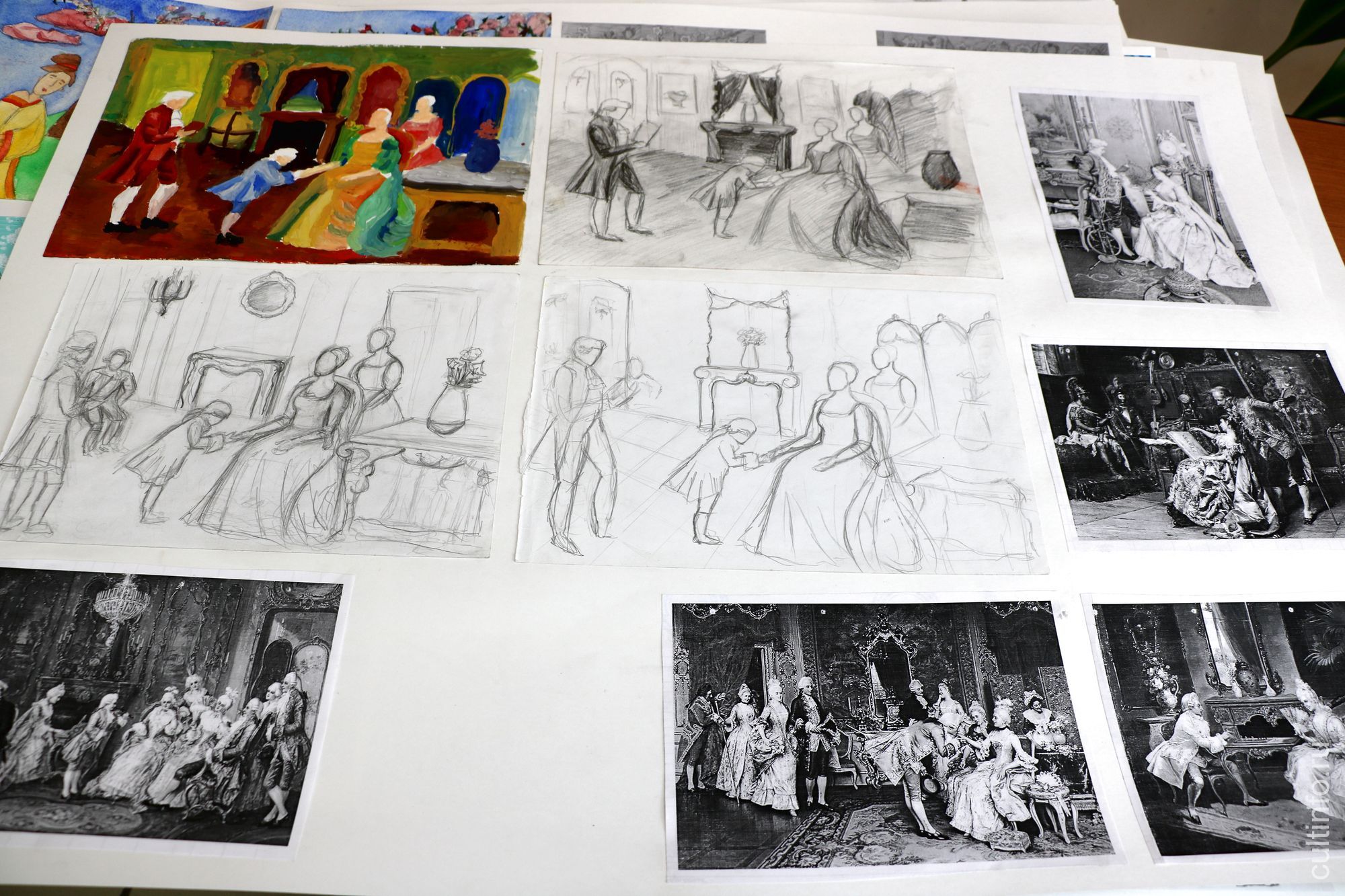 Выпускникам – авторам проектов по 14–15 лет, они прошли пятилетний курс обучения и признаются, что работа над экзаменационными проектами увлекла их и вдохновила на творчество. Сюжет своей работы ученики – в основном, это девушки – выбирали самостоятельно, советуясь с педагогом. Определить конкретную тему не просто, задачу усложнило и то, что работы необходимо было выполнить в большом формате: для графического листа это формат А2, для живописной станковой композиции – А1. «На итоговую работу выделено 45 часов учебного времени, – говорит преподаватель выпускных классов Ольга Кудрякова. – Из них 15 часов отводится на выполнение форэскизов – предварительных набросков, в общих чертах отражающих замысел, детального эскиза и проработки отдельных фрагментов композиции. Конечно, такая работа требует глубокого погружения в выбранную тему, проведения самостоятельного исследования: во внеучебное время ученики ищут информацию о том, как правильно изобразить, например, интерьер, костюмы героев, архитектуру».