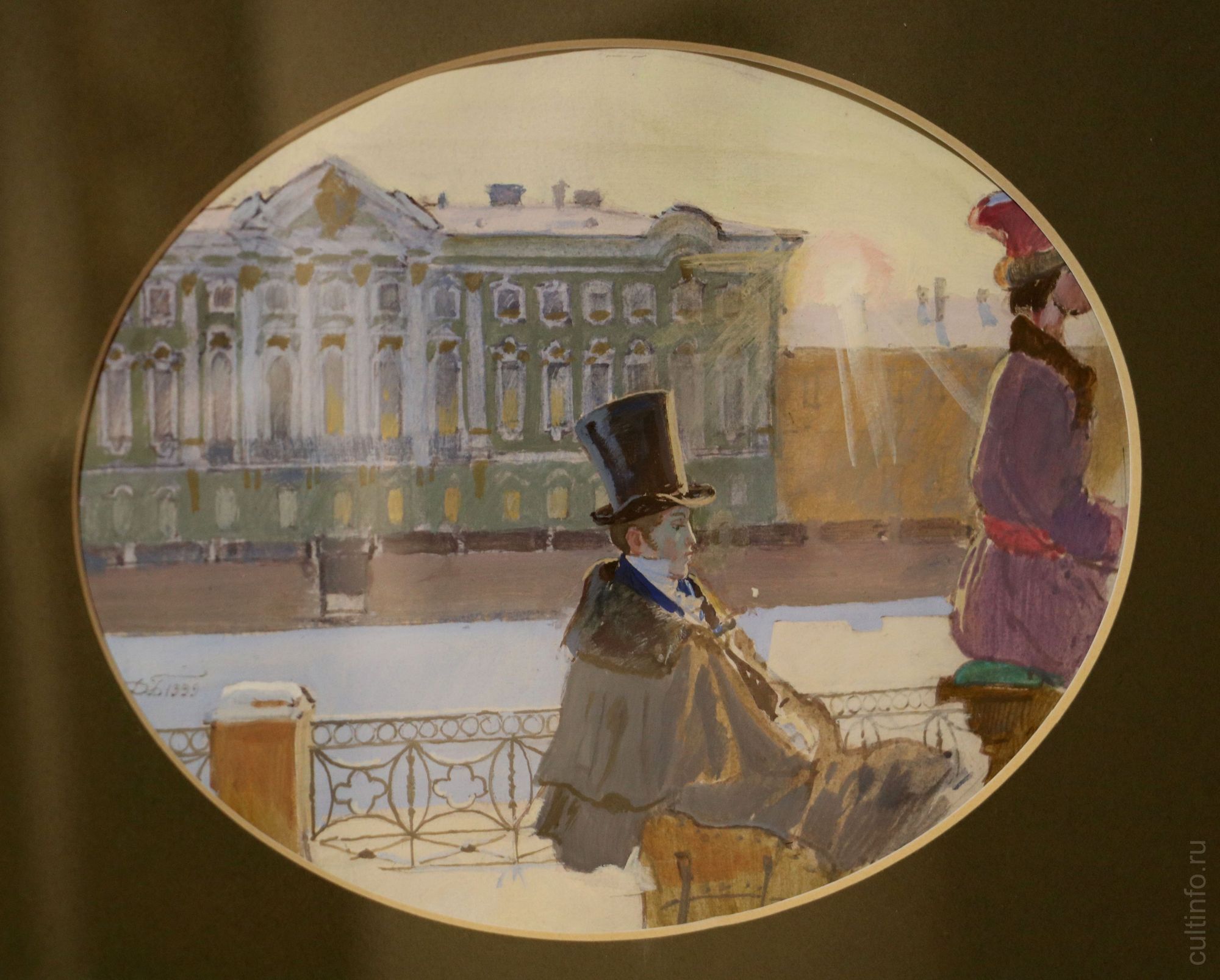 «Пушкинская эпоха – самая любимая мною. Жалею, что не родился тогда. Я влюблен в ее краски и пейзажи, нравы и обычаи, интерьеры и костюмы. Тема эта неисчерпаема…», – признается Дмитрий Анатольевич. Эта любовь отражена в серии «Пушкиниана», над которой художник работал шесть лет. Для её создания автор досконально изучил эпоху, костюмы, быт, пейзажи Петербурга и Москвы начала XIX века, а роман «Евгений Онегин» стал его настольной книгой. «Я знаю «Онегина» наизусть. Это моё любимое произведение. Книга мудрости, философии – глубочайшая вещь», – поделился Дмитрий Анатольевич.