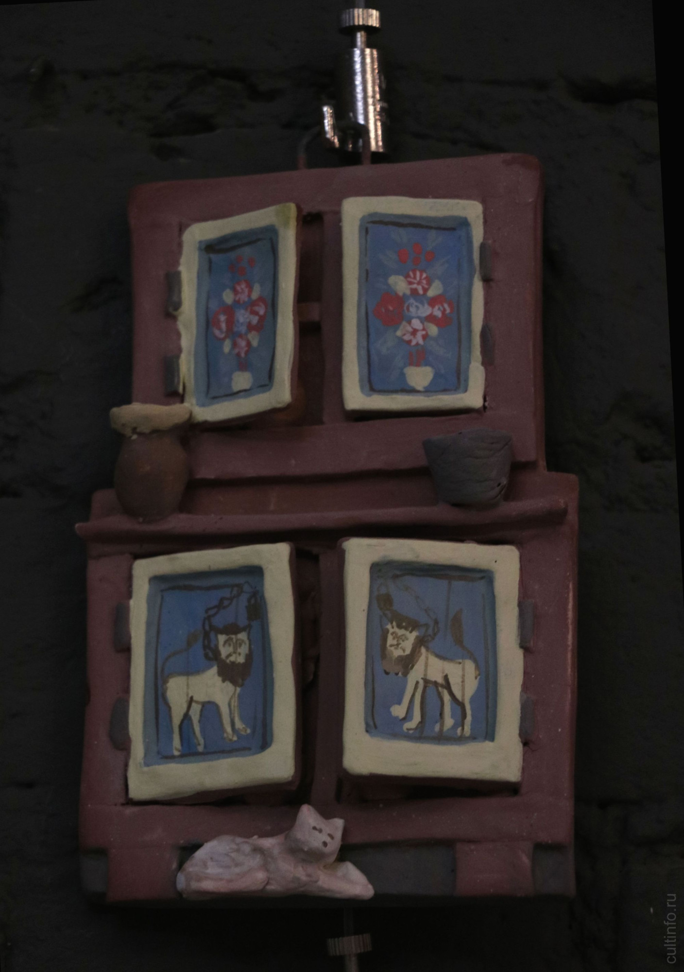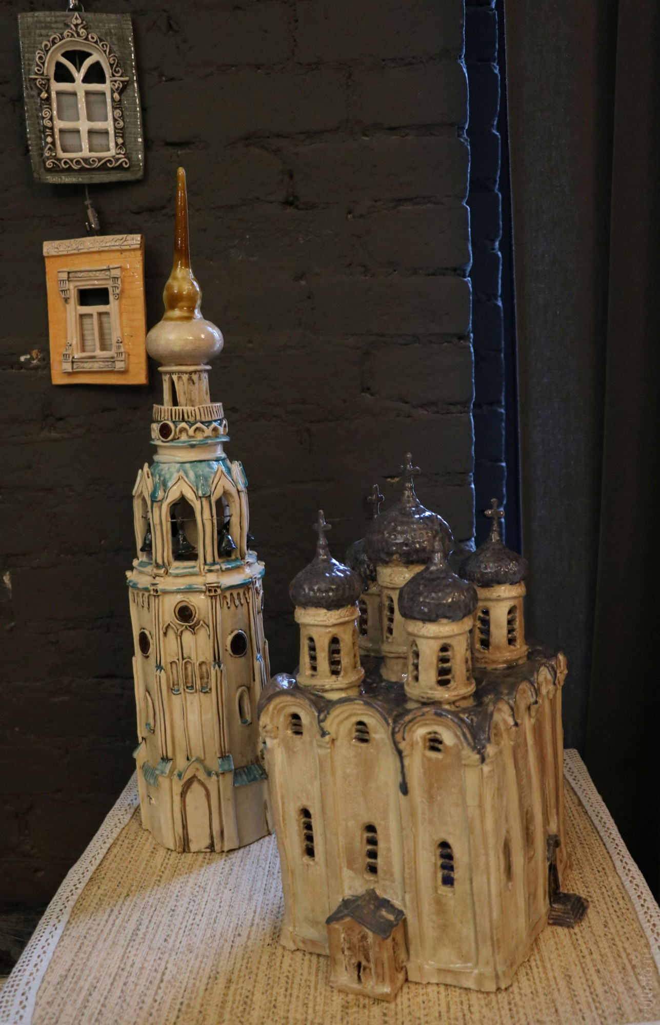 Объемно-скульптурные дома-светильники, окна-панно с резными наличниками и дремлющими на подоконниках кошками, керамические настенные картины с изображением фасадов зданий передают особенный дух Вологды.