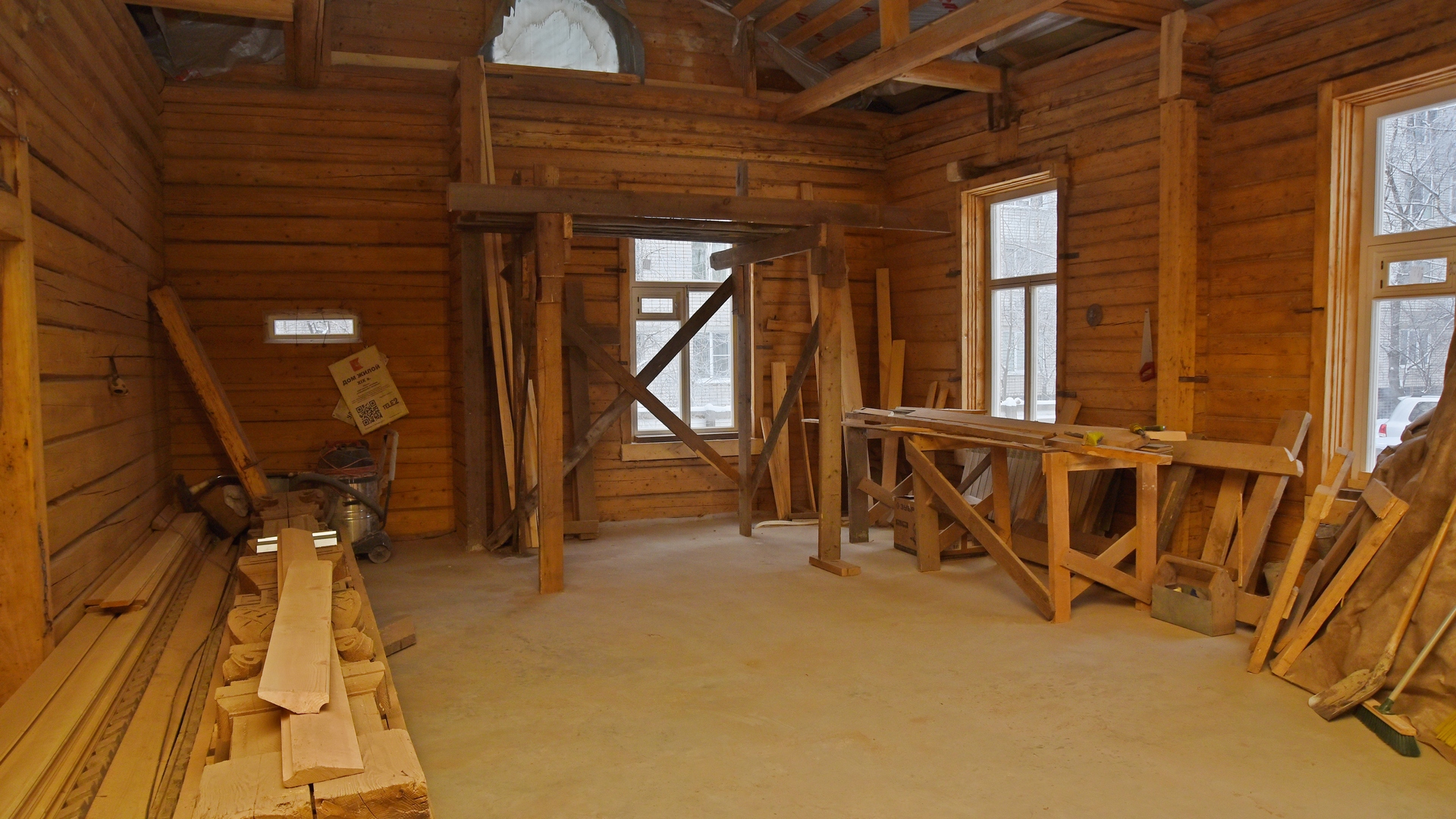 Одноэтажный дом площадью около 1000 кв. метров имеет цокольный и мансардный этажи. Их соединит лестница из железа и стекла в стиле хай-тек, по задумке специалистов она станет одним из современных элементов в здании. Также принято решение показать в интерьерах бутовый фундамент, для формирования которого используются природные камни. Интерьерной деталью станут и обнаруженные под штукатуркой изразцы одной из подлинных печей. Их реставраторы расчистят, но не будут восстанавливать полностью. Печь в стене закроют стеклом, и она станет своеобразным экспонатом памятника деревянного зодчества.