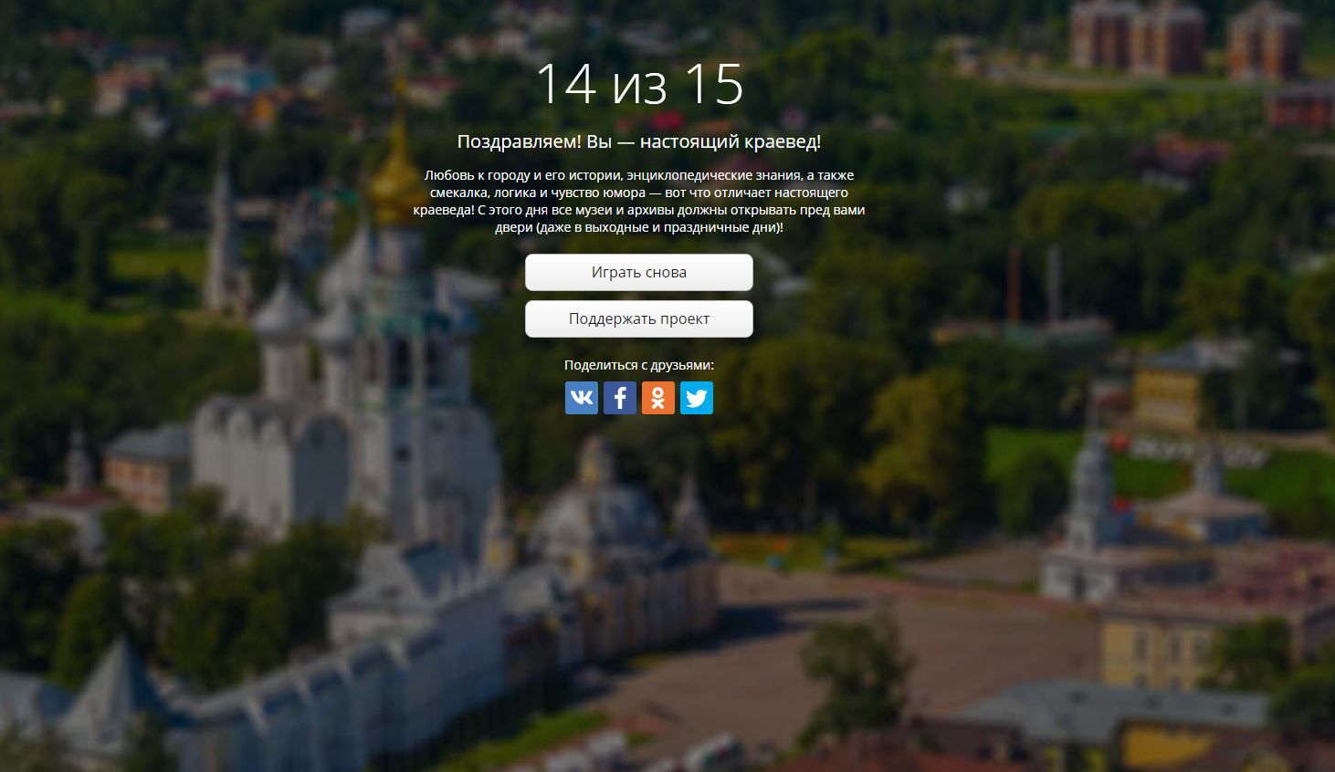 Нельзя не согласиться с авторами игры и в том, каким они видят «настоящего краеведа»: его отличают «любовь к городу и его истории, энциклопедические знания, а также смекалка, логика и чувство юмора». Чувствуется, что именно это и вдохновляло создателей игры, и она получилась не только интересной и познавательной, но и веселой. По заданию редакции автор материала сыграла в игру – по-честному, не гугля ни одного вопроса! – и получила результат 14 из 15 (подкосил вопрос про старое здание вокзала), но главное – не цифры верных/неверных ответов, а настоящая радость от новой встречи со своим городом.
