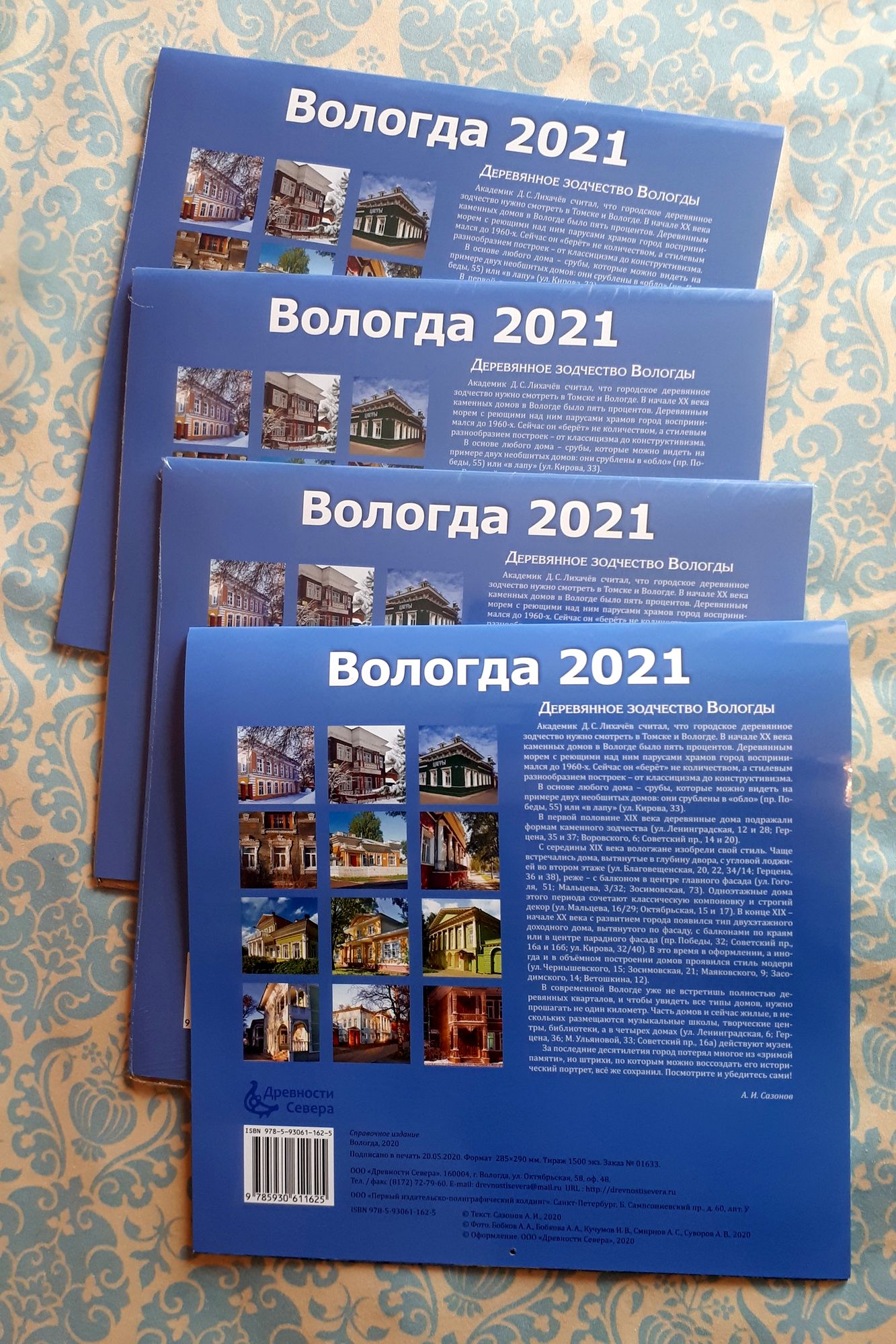 Календарь издан научно-издательским центром «Древности Севера». Это второй опыт такого издания – первый календарь, посвященный вологодскому деревянному зодчеству, был выпущен к 2019 году, издание пользовалось большим спросом и быстро разошлось в продаже. Это универсальный подарок для друзей, коллег и родственников, причем не только на новогодние праздники, а также прекрасный сувенир, напоминающий о Вологде. Календарь в упаковке хорошо смотрится и удобен для перевозки: каждый экземпляр упакован в пленку с картонной подложкой для жесткости.