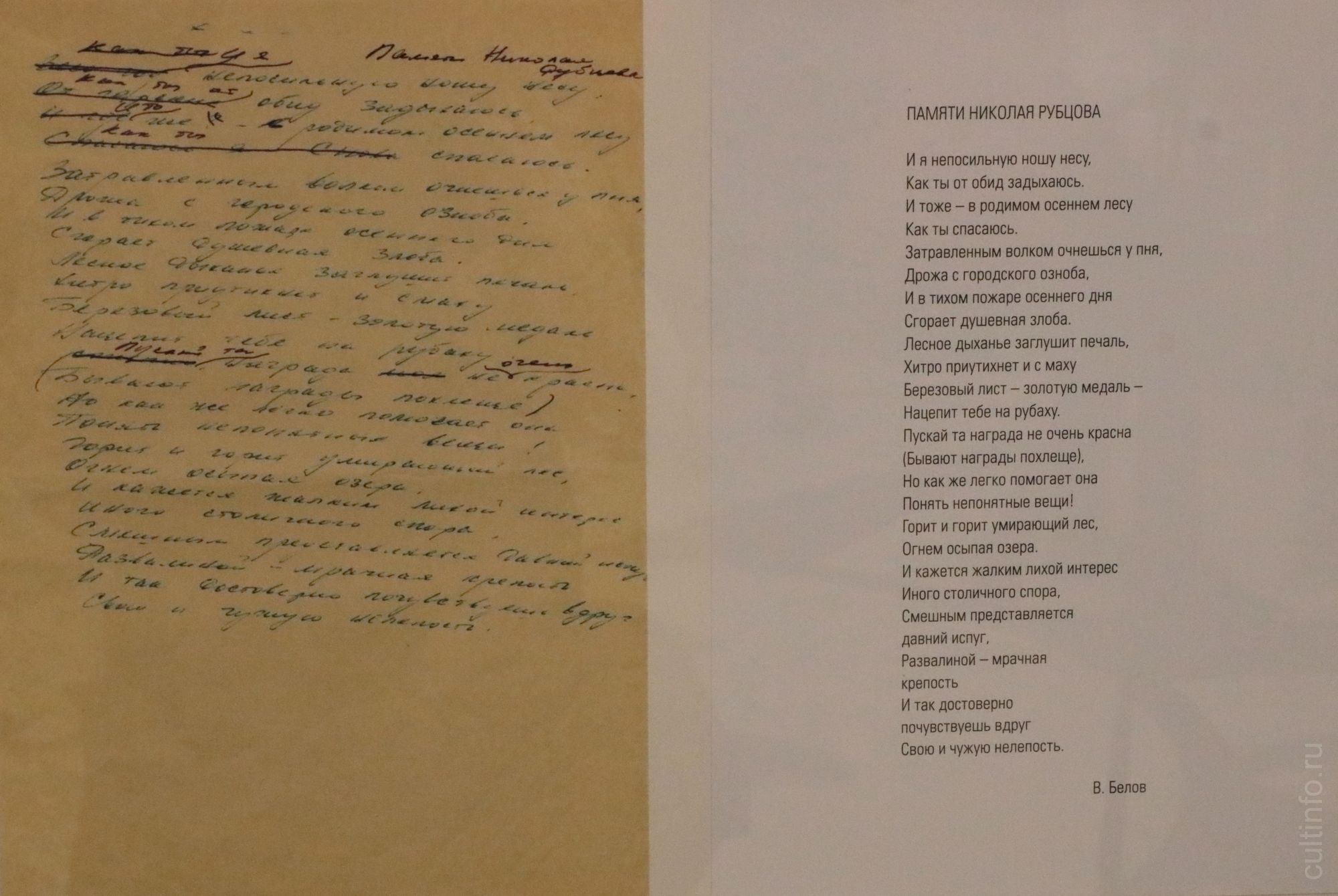 «С каким глубоким уважением и почтением Николай Рубцов относился к Александру Яшину, какие письма ему писал и как был благодарен за то, что он читает его стихи! Менее возвышенные, простые человеческие отношения связывали поэта с Василием Беловым, – рассказывает заведующая музеем «Литература. Искусство. Век XX» Елена Романова. – Одно из самых известных стихотворений Рубцова «Тихая моя родина» посвящено Белову. Оба они всей душой переживали за дальнейшую судьбу русской деревни, любовь к которой чувствовали с младенческих лет. Не случайно Николай Рубцов взял для своего стихотворения строчку из рассказа Белова «На родине», которую тот ему подарил: «Тихая моя родина, ты все так же не даешь мне стареть и врачуешь душу своей зеленой тишиной».