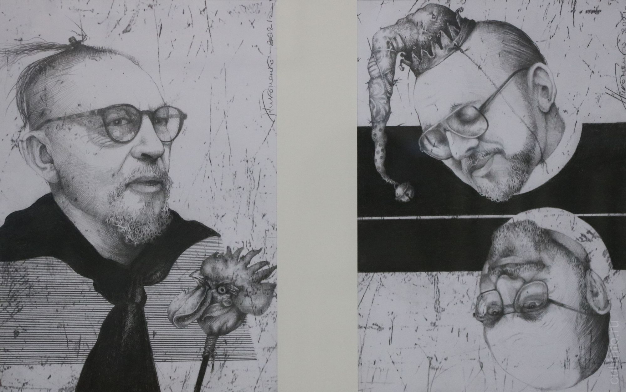«Жанр своих черно-белых работ я бы обозначил, как «графический театральный коллаж». Часть этого всего я придумал, а что-то нарисовал так, как оно есть в жизни», – отметил автор.