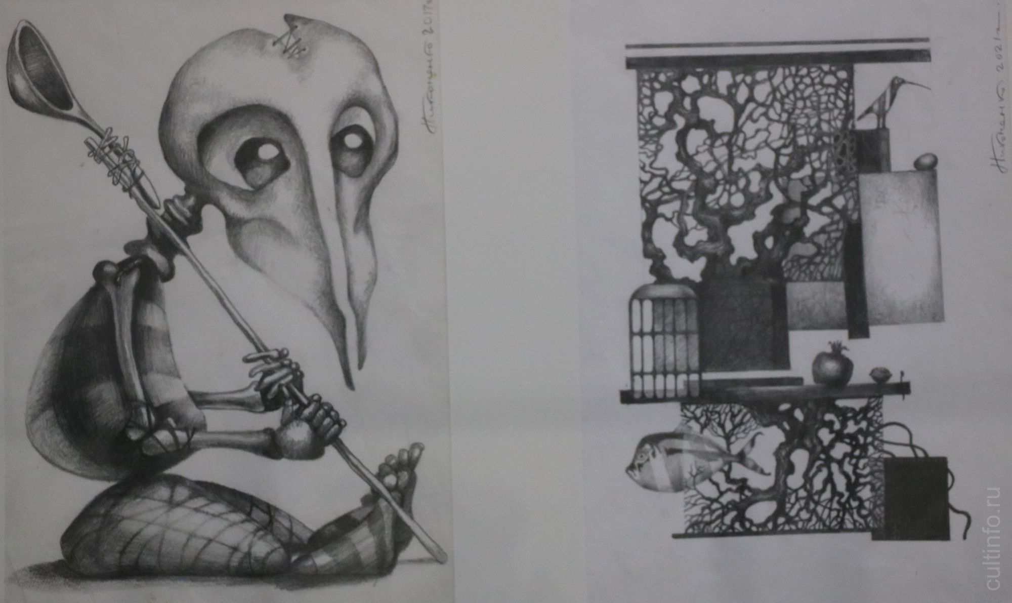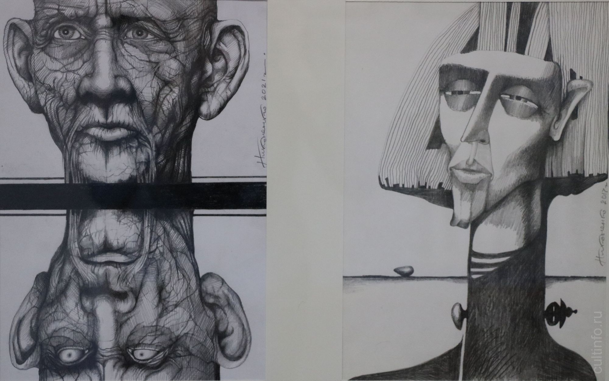 Виктор Никоненко – живописец и график, художник театра и кино, создатель сценографии более 90 спектаклей в драматических, музыкальных театрах и театрах кукол в России и за рубежом, лауреат премии «Золотая маска». Домашнее заточение во время пандемии вдохновило художника на создание целой серии работ. Символично, что первый рисунок, созданный в тот период, называется «Я в домике» – это автопортрет с ракушкой на голове. «Я был вдали от мастерской и без красок, а дома нашлись только карандаши. Так возникла серия графических "Черно-белых историй"», – рассказал Виктор Леонидович. Увидеть их и «прочитать», открывая скрытые смыслы, можно в одном их залов Дома Корбакова.