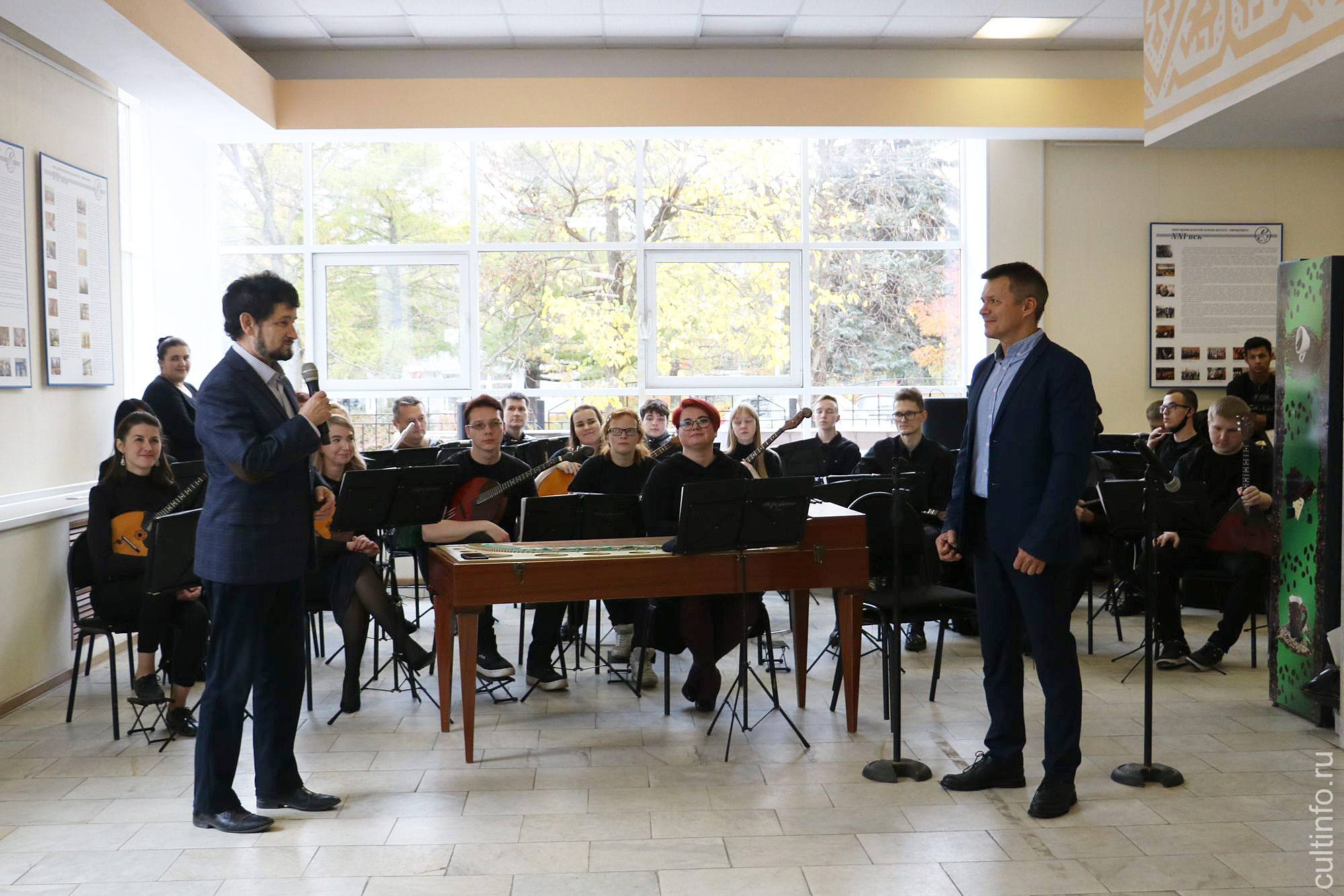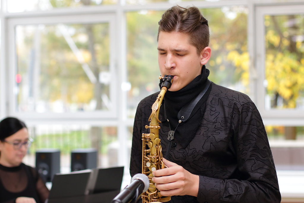 На импровизированной сцене в фойе выступили студенты отделения оркестровых духовых и ударных инструментов Иван Погудин и Екатерина Резанова с преподавателем заслуженным работником культуры РФ Сергеем Кузнецовым.