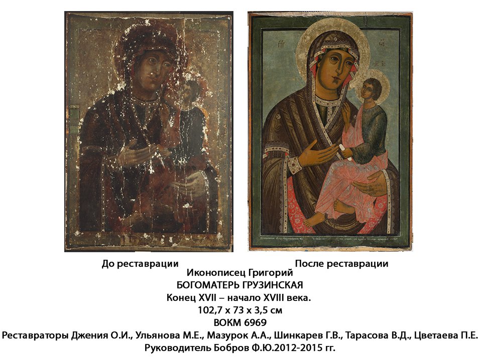 Виртуальную экспозицию составили 47 произведений темперной и масляной живописи, и у зрителя есть возможность сравнить их состояние до и после реставрации. Над восстановлением этих предметов работали специалисты из Петербурга, и виртуальная выставка приурочена к 50-летию реставрационной мастерской Санкт-Петербургской Академии художеств.