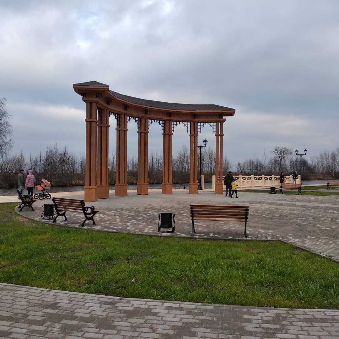 Главным украшением набережной станет величественная аркада, состоящая из семи колонн высотой по 6 метров – она уже установлена. В настоящее время благоустройство завершается: уложена брусчатка, устроена пешеходная зона в деревянном исполнении, оборудован спуск для лодок, произведен монтаж уличных светильников, установлены смотровые балконы, высажены саженцы клёна, каштана, сосны и сербской ели. Близятся к финалу работы на деревянной мостовой, идет обустройство парковки, вскоре будут установлены игровые и спортивные комплексы для детей и фотозоны.