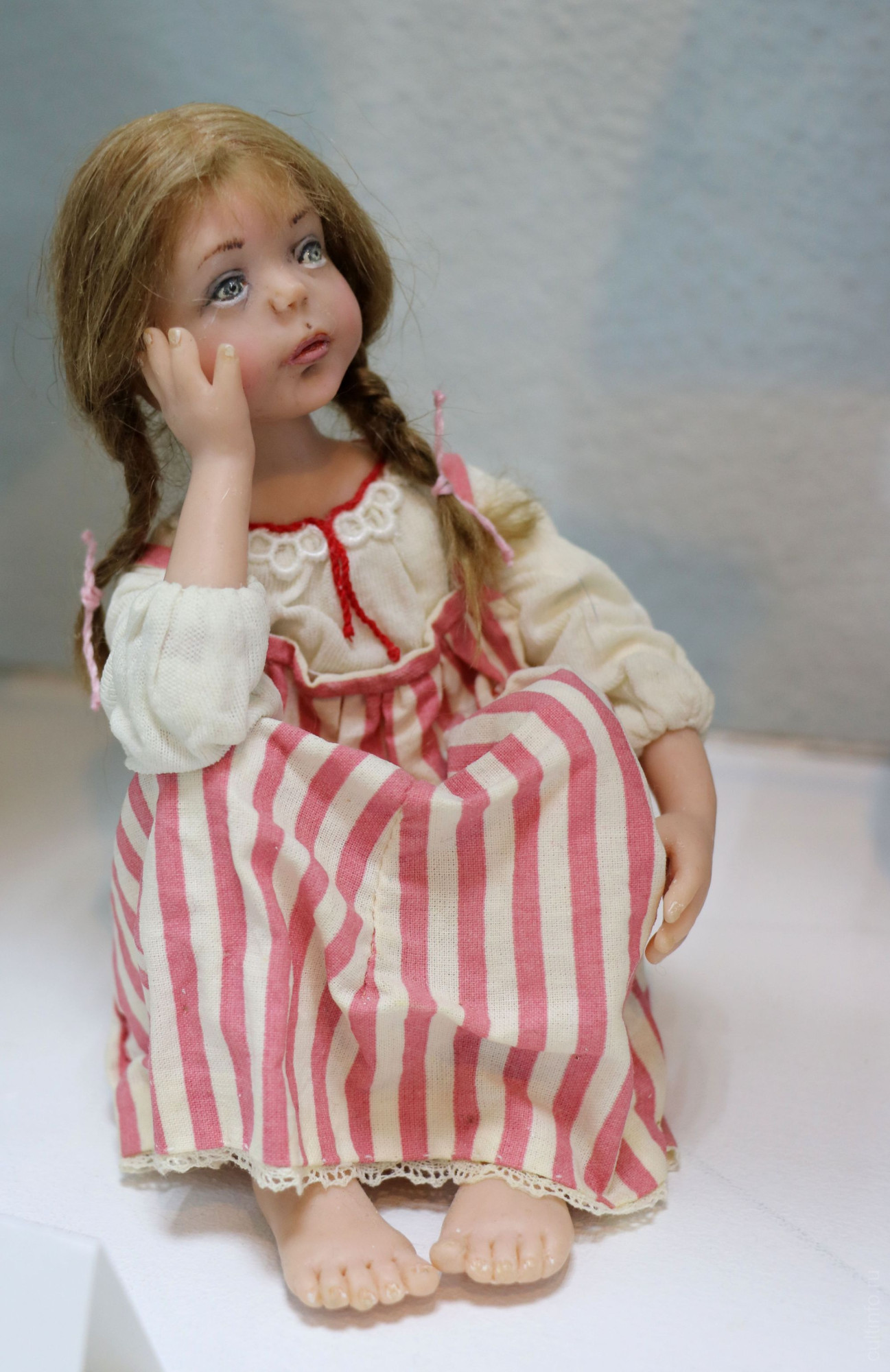 «Чердачная» кукла Марины Прутковой – специально состаренная. Ее наряд словно выцвел от времени, а сама кукла выглядит так, словно ее, изрядно запылившуюся, недавно нашли в укромном месте на чердаке. Оказывается, сложнее всего было состарить шерсть, из которой автор сделала волосы.