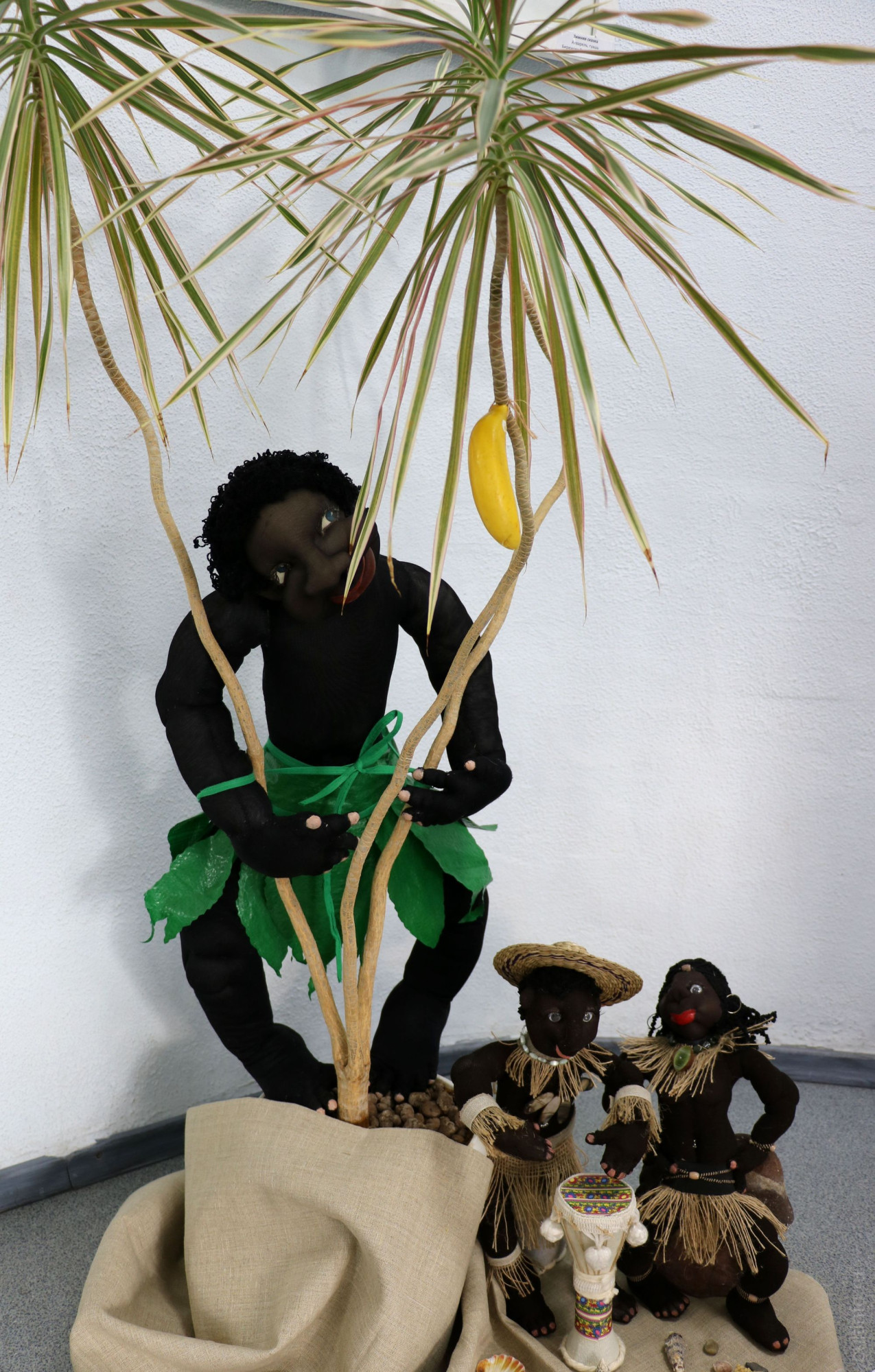 Встречают посетителей выставки забавные кучерявые африканцы, созданные вологжанкой Татьяной Ступиной. «Иностранные гости» находятся в своей привычной среде: они расположились под декоративной пальмой, которая, как нельзя кстати растет в Фонде поддержки гражданских инициатив. Внутри игрушек спрятан прочный каркас из проволоки – он позволяет им принимать любую форму. Туловища набиты синтепоном, а на головы – есть в этом что-то детективное – надеты капроновые чулки. Прически игрушкам мастерица соорудила из «кудрявых» ниток – для этого пришлось распустить черные перчатки.