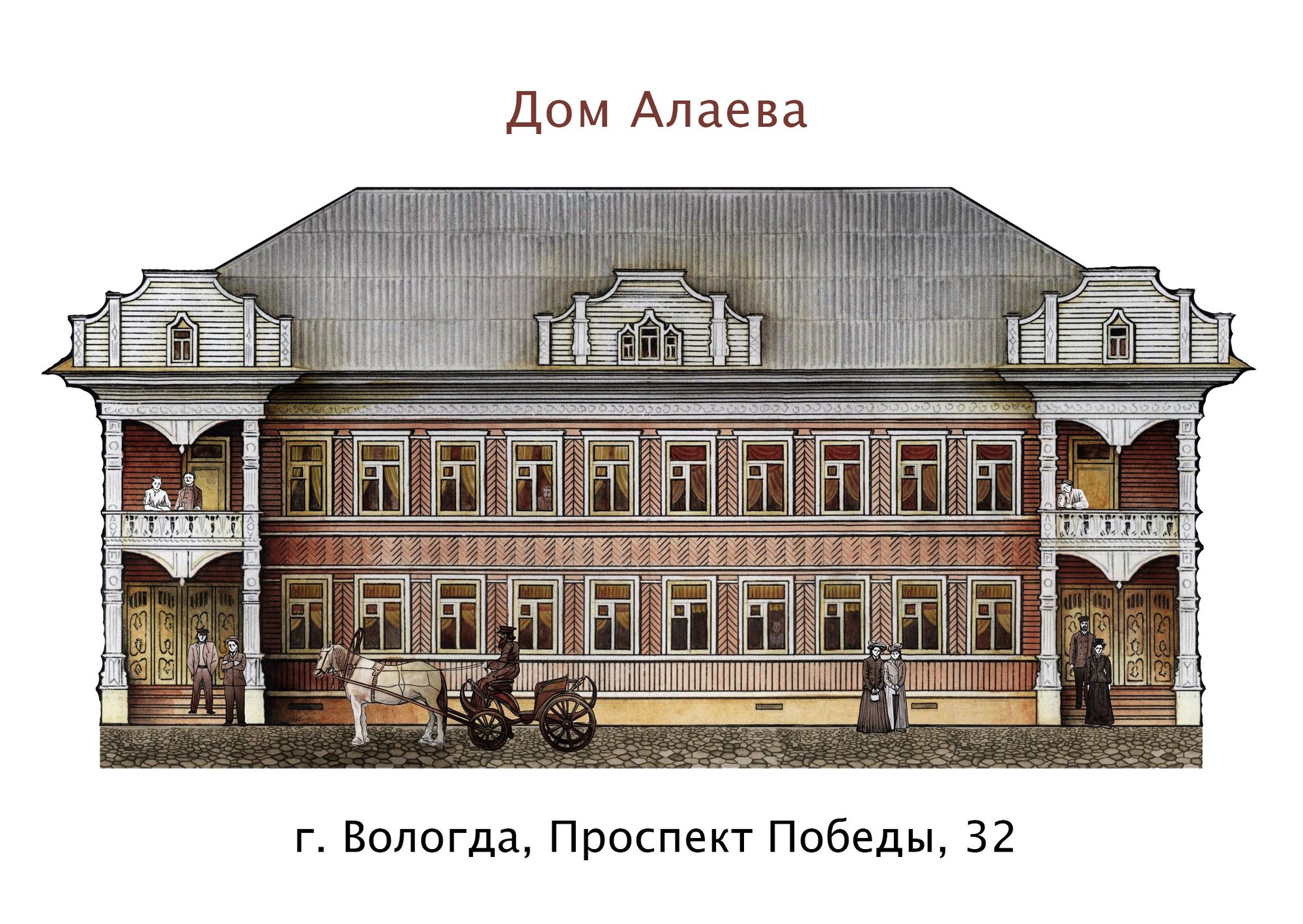 Рассматривая магниты и открытки, можно познакомиться с конкретным эпизодом истории каждого дома. Например, дом на Маяковского, 9 – так называемый «дом с зайцами» – изображен после переноса с улицы Добролюбова, и рядом отдыхают рабочие, которые собрали дом на новом месте. Мимо дома Алаева на проспекте Победы, 32, катит бричка, у дома Макаушкина на улице Мальцева, 3 ведет экскурсию известный вологодский экскурсовод Александр Сазонов, а дом Красильникова на Благовещенской, 22 красят волонтеры первого вологодского «Том Сойер Феста», прошедшего в 2018 году. Есть среди сувениров и напоминание о «доме со штурвалами» на Пречистенской набережной, 18, уничтоженном пожаром.