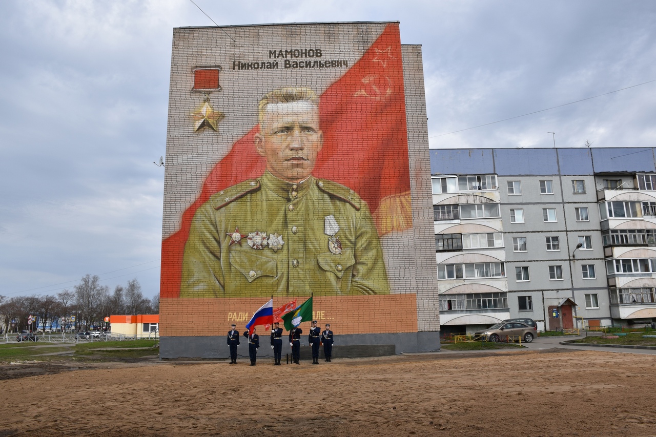 В канун Дня Победы в Соколе появился 17-метровый портрет легендарного земляка, Героя Советского Союза Николая Мамонова, нанесенный на фасад жилого дома на ул. Советской, 66. Автором масштабного граффити стал вологодский художник Олег Иванов.