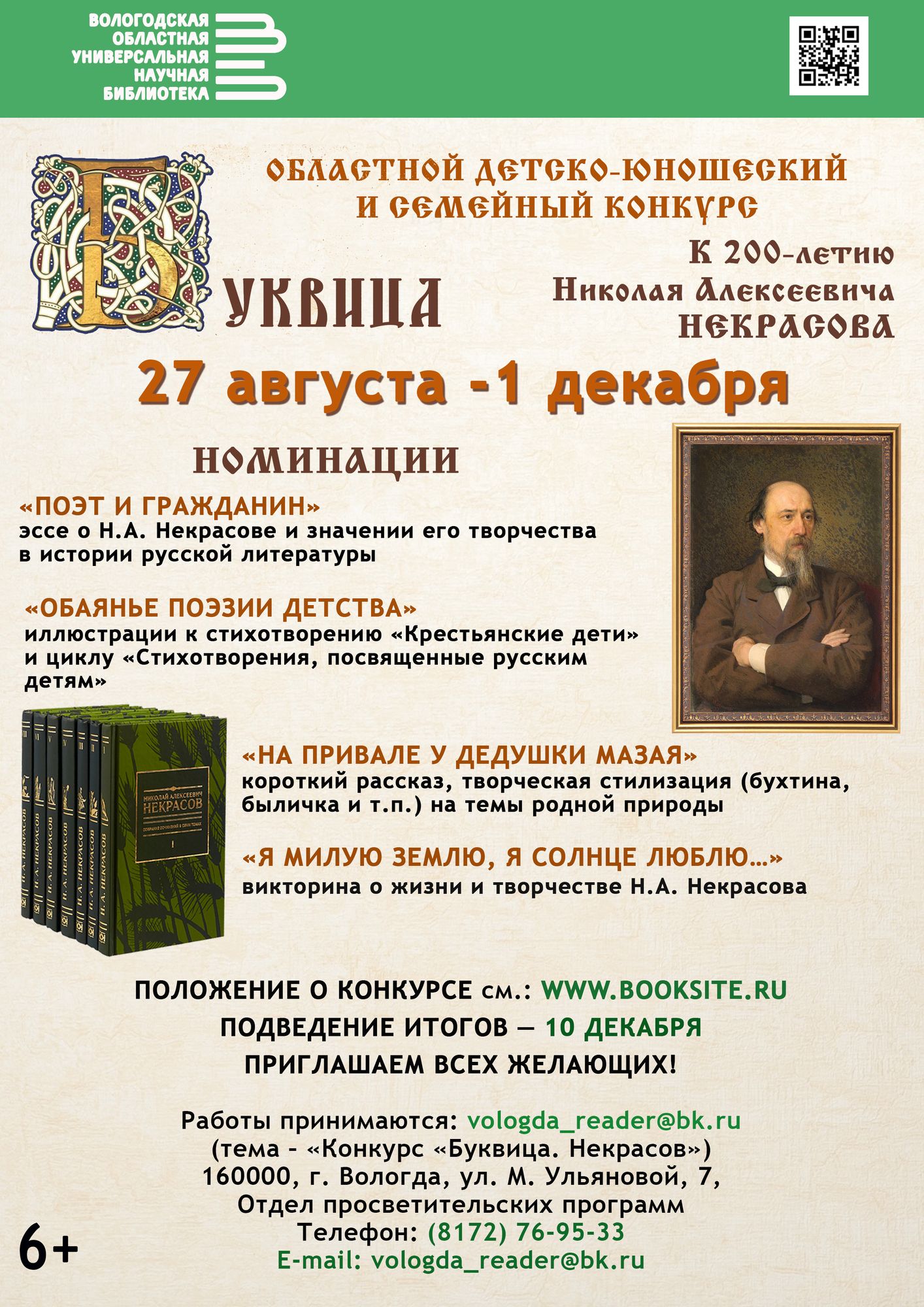 Областной детско-юношеский и семейный конкурс «Буквица» в текущем году посвящен 200-летию со дня рождения поэта Николая Алексеевича Некрасова (1821–1877). Организатор мероприятия – Вологодская областная универсальная научная библиотека. К участию в конкурсе приглашаются не только индивидуальные участники, но и семейные коллективы.