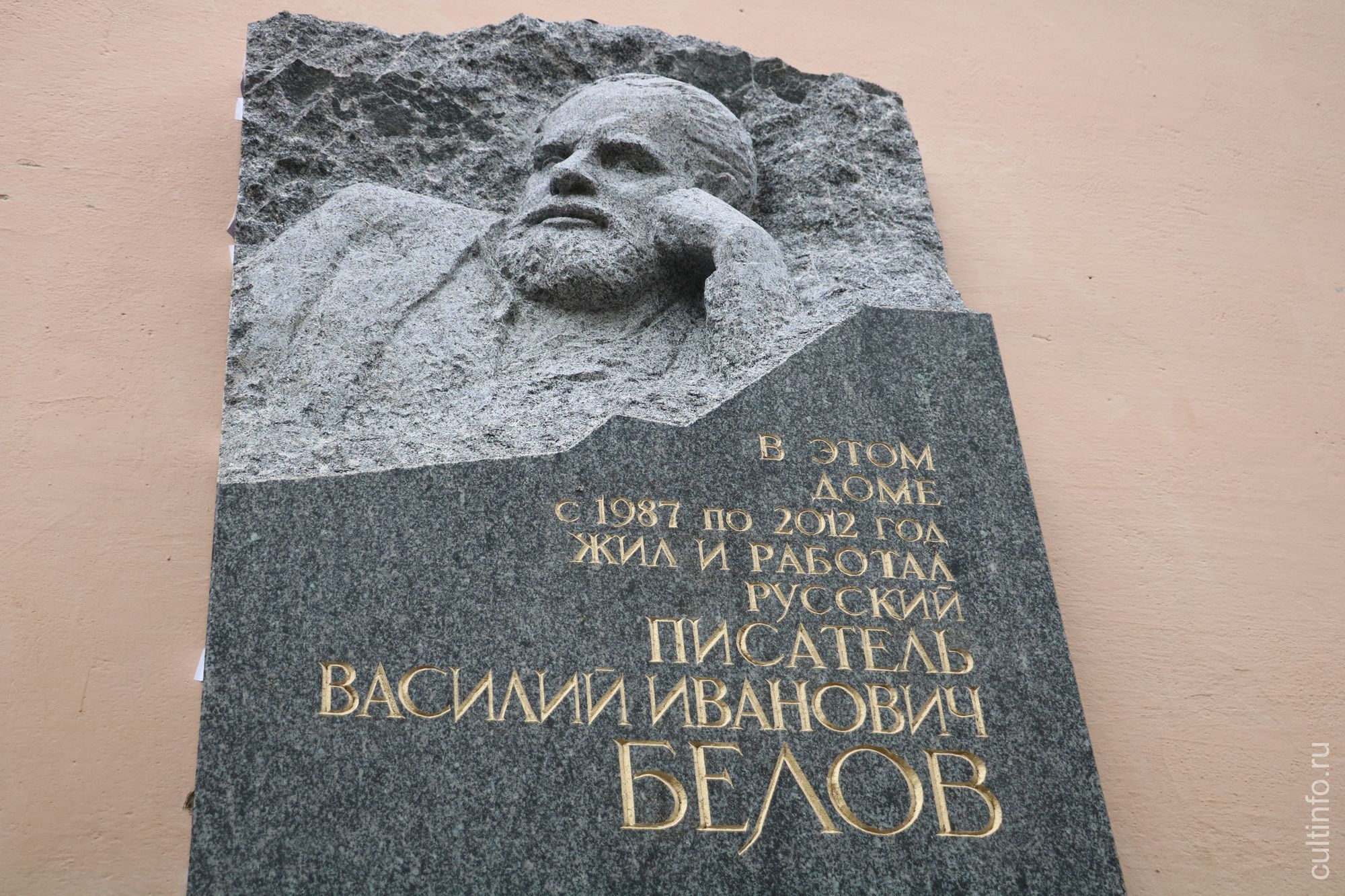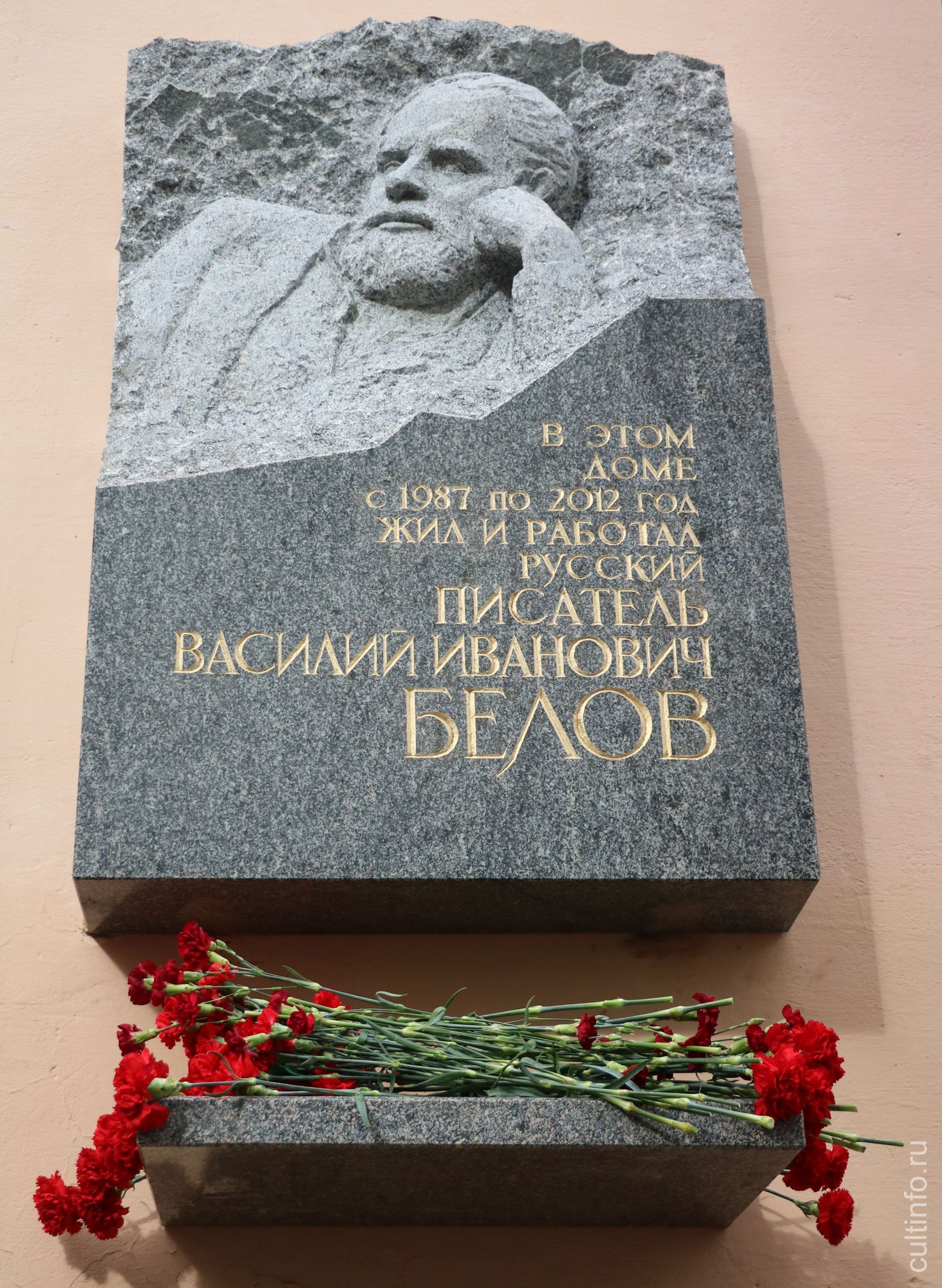 Мемориальную доску на доме по улице Октябрьская, 10, торжественно открыли сегодня, 11 сентября. Внушительный гранитный горельеф, изображающий писателя-мыслителя, дополняется надписью, которая должна читаться издалека: «В этом доме с 1987 по 2012 год жил и работал русский писатель Василий Иванович Белов». В церемонии открытия памятного знака приняла участие дочь писателя Анна Васильевна Белова, вологодские писатели и общественные деятели, представители музейного и библиотечных сообществ, художники, деятели культуры, члены областного Правительства, представители Законодательного собрания области и Администрации города Вологды, а также учащиеся вологодской школы № 21, носящей имя Василия Белова.
