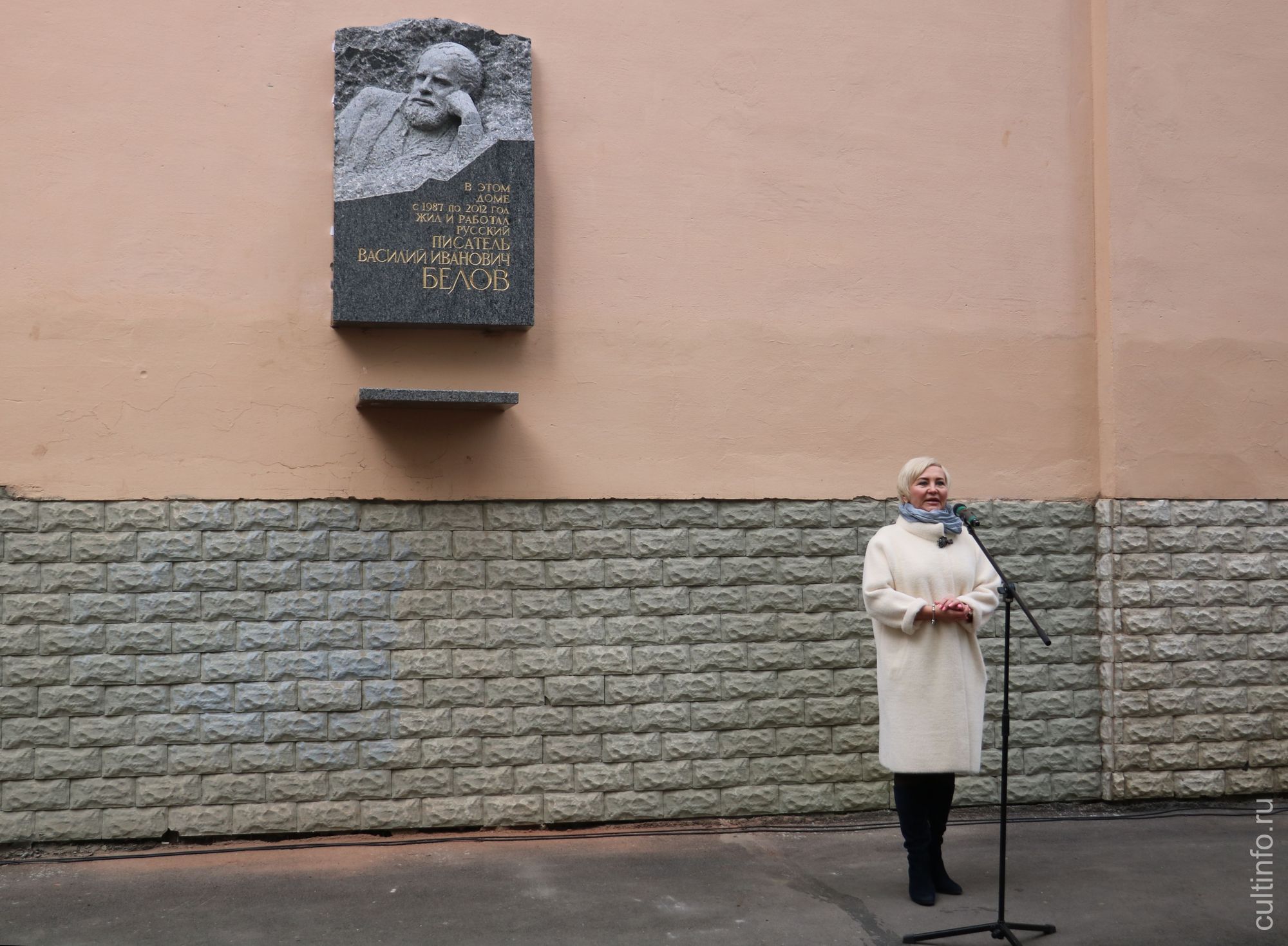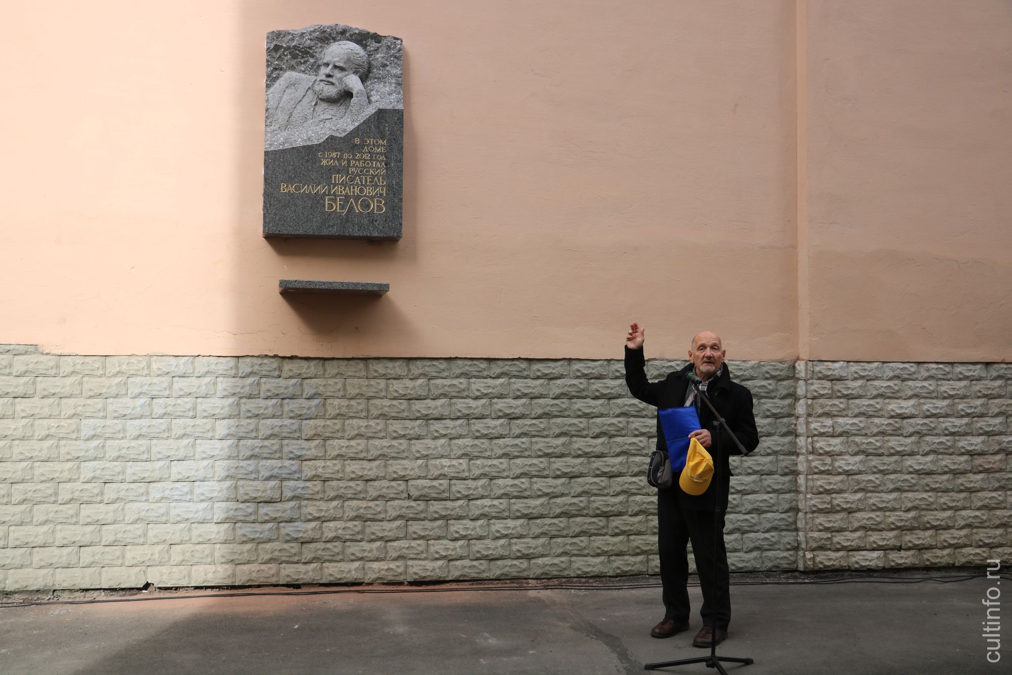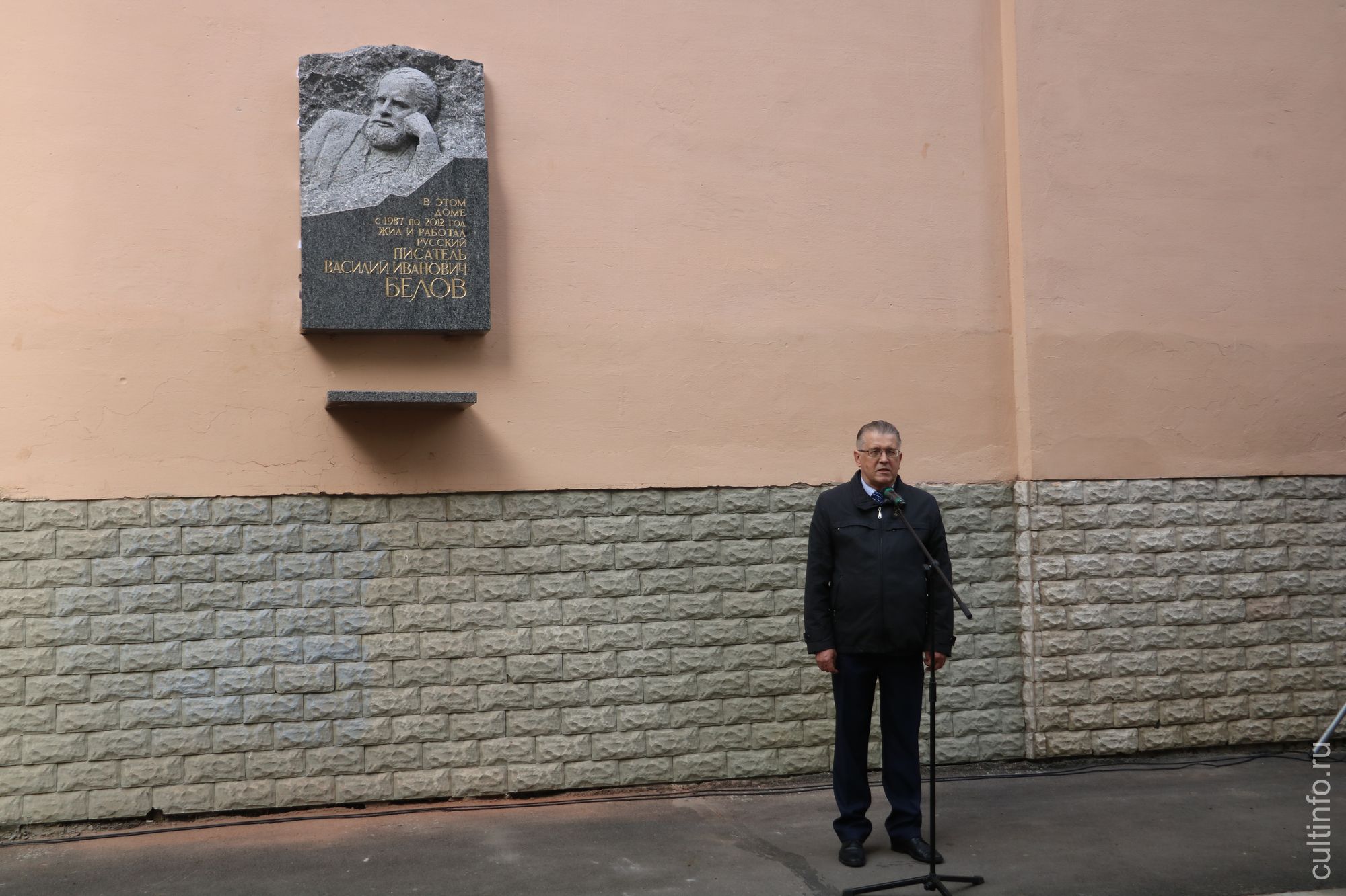 Супруга Василия Белова Ольга Сергеевна не смогла присутствовать на открытии памятной доски на доме, где жила их семья, но написала приветственный адрес, в котором выразила признательность и благодарность за осуществление этого проекта: «В этом доме Василий Иванович прожил 25 лет, здесь написал значительные произведения – закончил романы «Год великого перелома» и «Час шестый» о трагических событиях жизни крестьян в период коллективизации. Здесь написал «Лад» – удивительную книгу о русской крестьянской цивилизации. Продолжил юмористические, сатирические «Бухтины…», создал пьесы, спектакли по которым идут в лучших театрах Москвы и Санкт-Петербурга, написал рассказы для взрослых и детей. В последние годы увлекся публицистикой, где яростно выступал как гражданин и патриот. В этот дом приезжали его друзья, единомышленники, известные писатели и деятели искусства, сюда приходили люди со своими простыми житейскими проблемами, здесь велись жаркие споры о судьбе России, о быстро меняющейся жизни, о техническом прогрессе, о смысле жизни и о вечности. Отсюда он ушел в мир иной. Некоторые сборники рассказов и очерков начинаются со слов «раздумья на Родине», «раздумья о дне сегодняшнем». Глубокие размышления думающего человека хорошо отразил в своей работе талантливый петербургский скульптор Юрий Евграфов».
