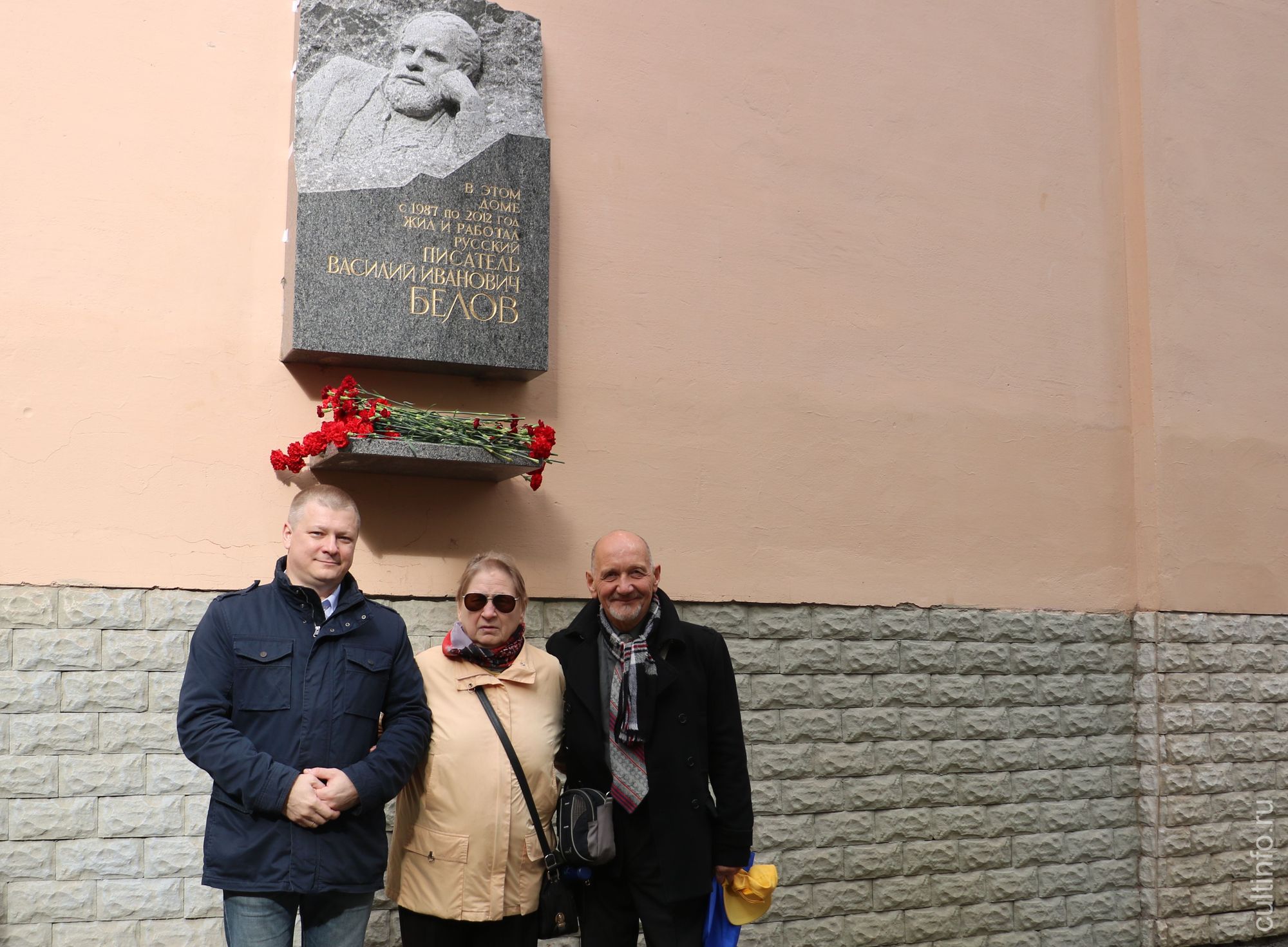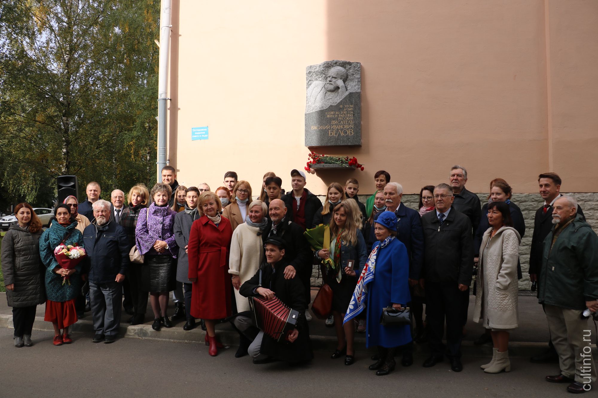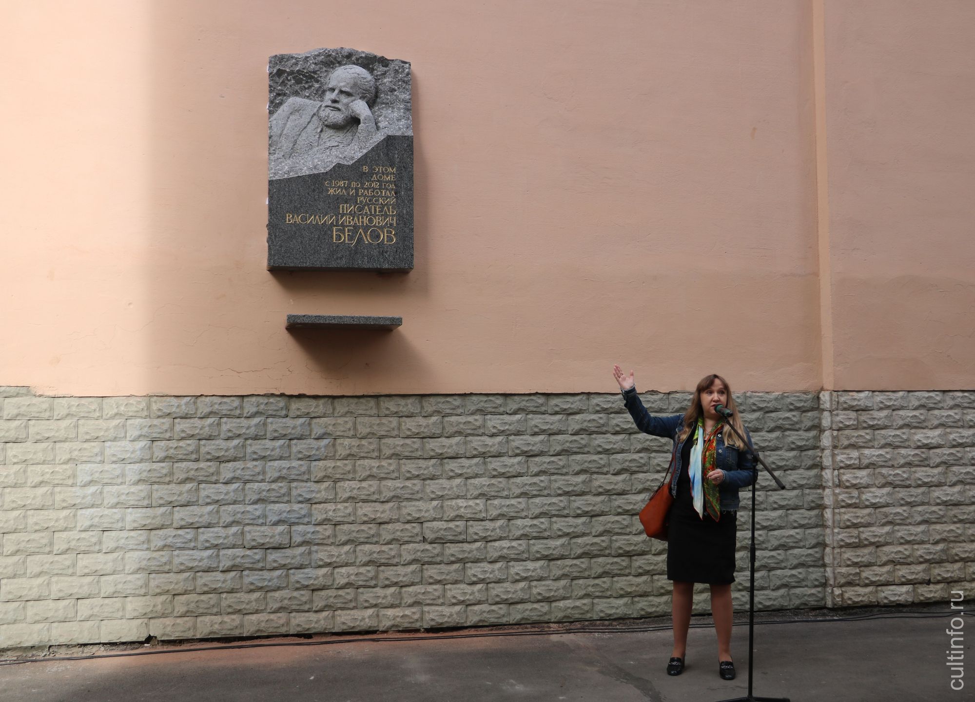 Супруга Василия Белова Ольга Сергеевна не смогла присутствовать на открытии памятной доски на доме, где жила их семья, но написала приветственный адрес, в котором выразила признательность и благодарность за осуществление этого проекта: «В этом доме Василий Иванович прожил 25 лет, здесь написал значительные произведения – закончил романы «Год великого перелома» и «Час шестый» о трагических событиях жизни крестьян в период коллективизации. Здесь написал «Лад» – удивительную книгу о русской крестьянской цивилизации. Продолжил юмористические, сатирические «Бухтины…», создал пьесы, спектакли по которым идут в лучших театрах Москвы и Санкт-Петербурга, написал рассказы для взрослых и детей. В последние годы увлекся публицистикой, где яростно выступал как гражданин и патриот. В этот дом приезжали его друзья, единомышленники, известные писатели и деятели искусства, сюда приходили люди со своими простыми житейскими проблемами, здесь велись жаркие споры о судьбе России, о быстро меняющейся жизни, о техническом прогрессе, о смысле жизни и о вечности. Отсюда он ушел в мир иной. Некоторые сборники рассказов и очерков начинаются со слов «раздумья на Родине», «раздумья о дне сегодняшнем». Глубокие размышления думающего человека хорошо отразил в своей работе талантливый петербургский скульптор Юрий Евграфов».