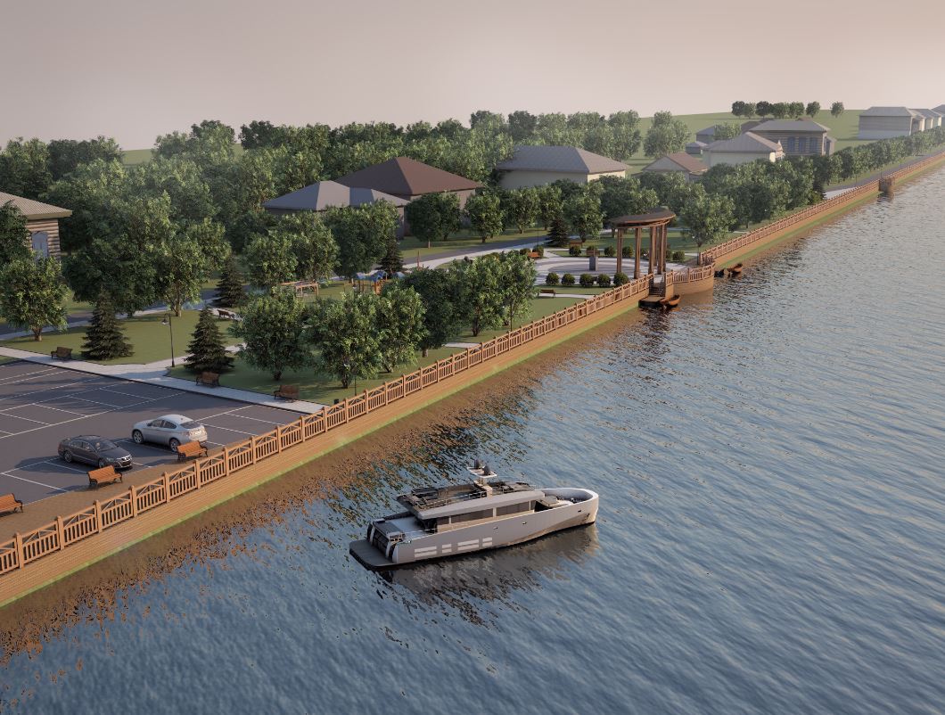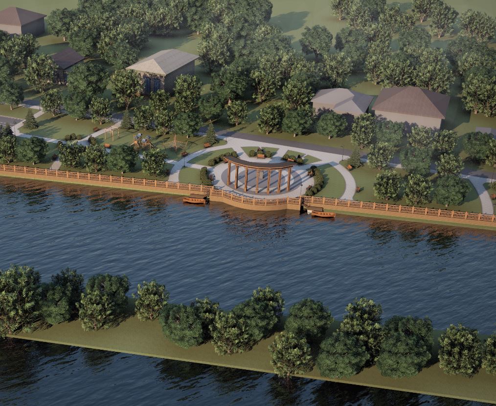 Работы по благоустройству набережной начались в апреле 2021 года. На сегодняшний день практически выполнен спуск для лодок, уложена брусчатка, готовится основание под установку деревянной мостовой. Накануне на набережной приступили к монтажу аркады – одного из центральных элементов архитектурного оформления рекреационной зоны. Аркада будет состоять из семи колонн высотой по 6 метров.