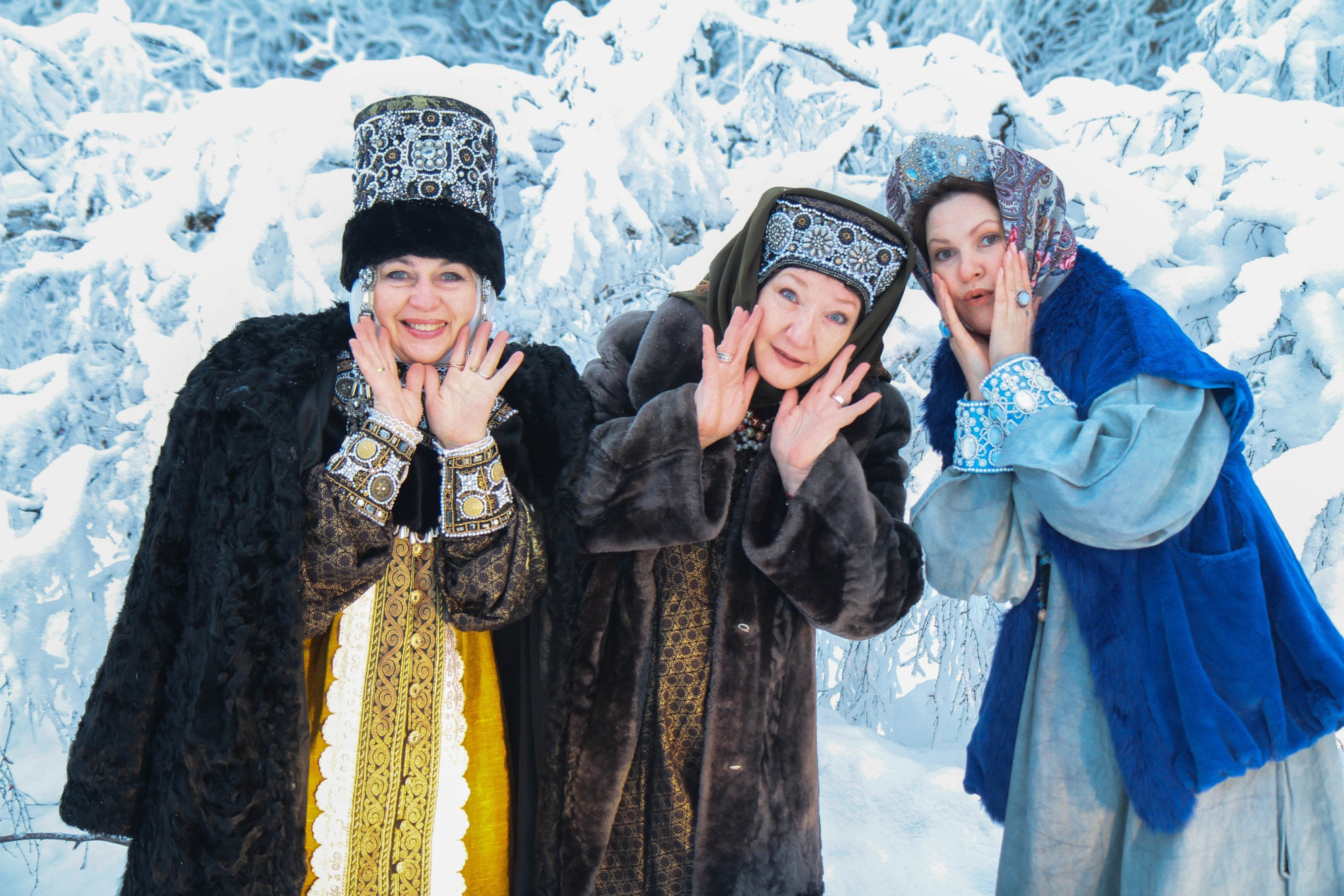 У них получились красивые фотографии на фоне заснеженного вологодского пейзажа. Изделия мастерицы прошиты золотыми нитями, украшены бисером, бусинами, камнями, изящной тесьмой и выглядят очень нарядно и торжественно.