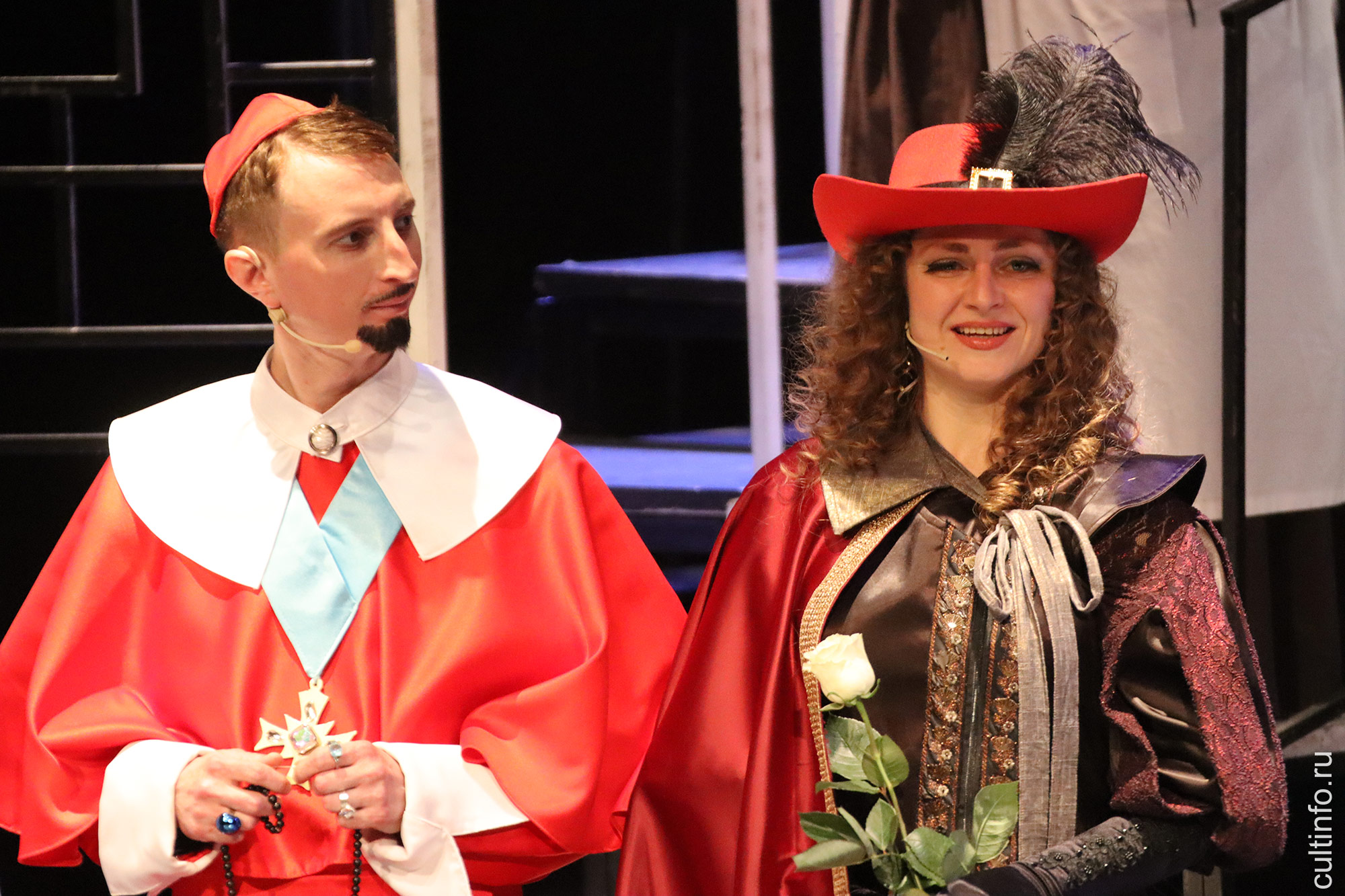 Второй гастрольный спектакль – мюзикл «Три мушкетера» (12+) на основе пьесы Марка Розовского по роману Александра Дюма – вологодские зрители увидели вечером. В спектакле прозвучали знакомые по одноименному советскому фильму песни, написанные композитором Максимом Дунаевским на стихи Юрия Ряшенцева, – это и знаменитая «Песня мушкетеров», «Пуркуа па», «Баллада о дружбе» и многие другие. «Покачивая перьями на шляпах», актеры Брянского ТЮЗа, сумели «завести» вологодскую публику так, что многие на выходе из зала продолжали петь. Спектакль «Три мушкетера» также покажут 18 и 19 ноября.