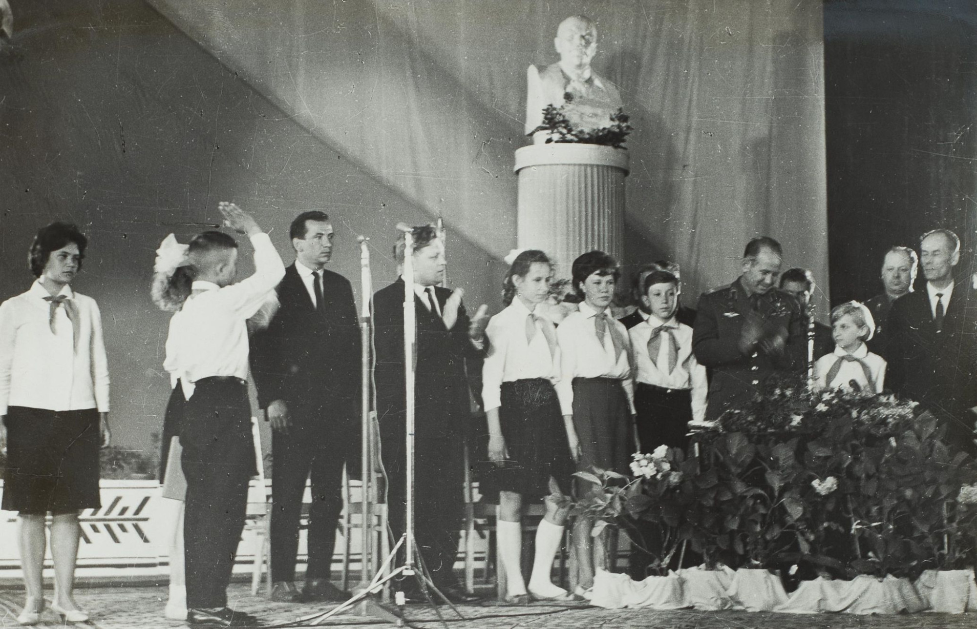 Лето 1965 года стало для сотен вологжан одним из самых радостных и запоминающихся. На Вологодчину прибыли звездные гости: экипаж космического корабля «Восход-2» в составе нашего земляка, капитана Павла Беляева и второго пилота Алексея Леонова, первого человека, вышедшего в открытый космос. Взрослые и дети с восторгом встречали прославленных героев. Одним из пунктов насыщенной программы пребывания летчиков-космонавтов в Вологде стала встреча с пионерами и школьниками. В торжественной обстановке на сцене Дворца культуры железнодорожников пионеры Вологды приветствовали Героев Советского Союза Леонова и Беляева и повязали им красные пионерские галстуки.