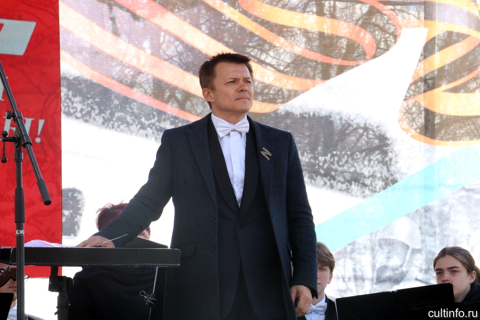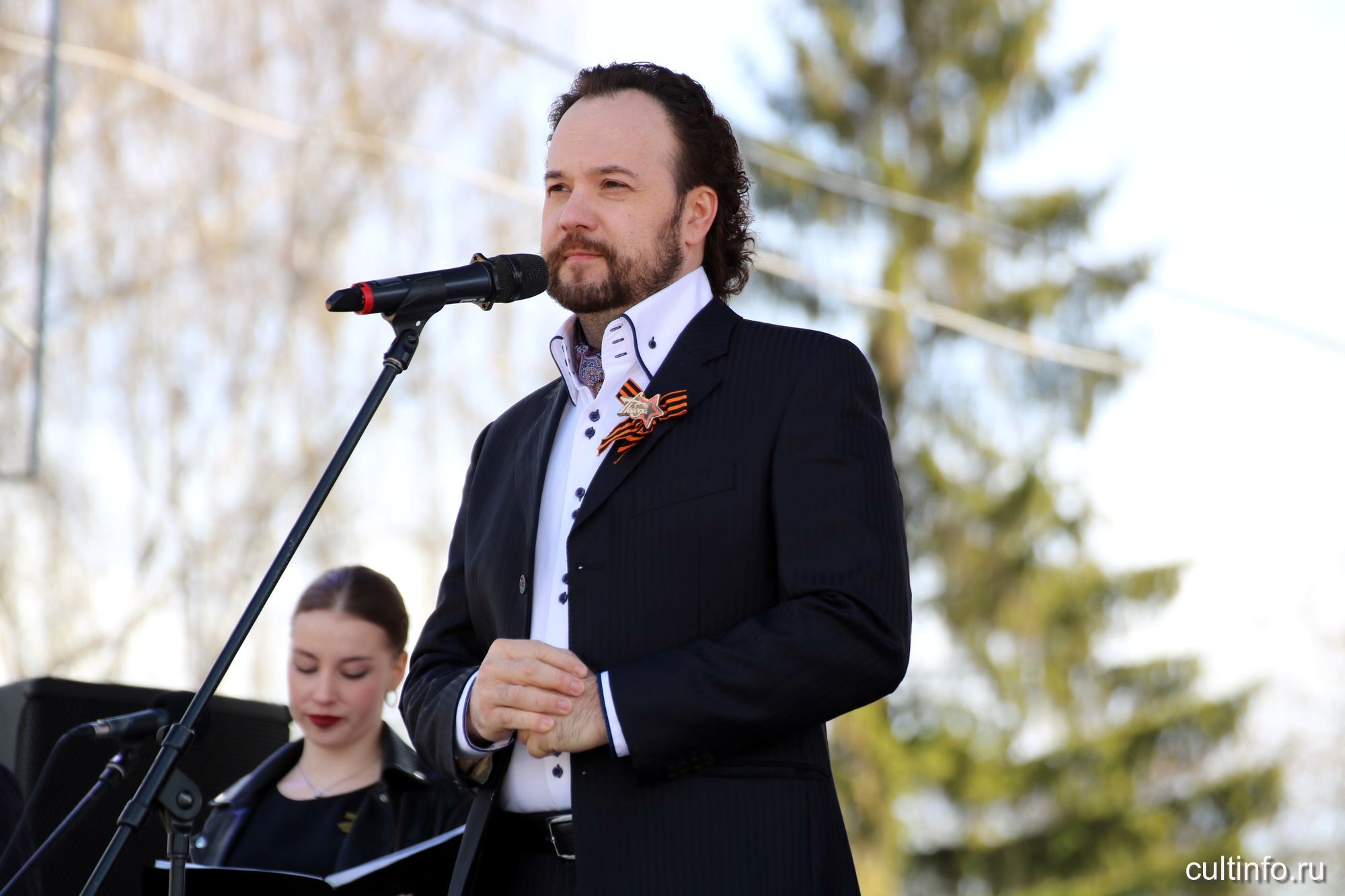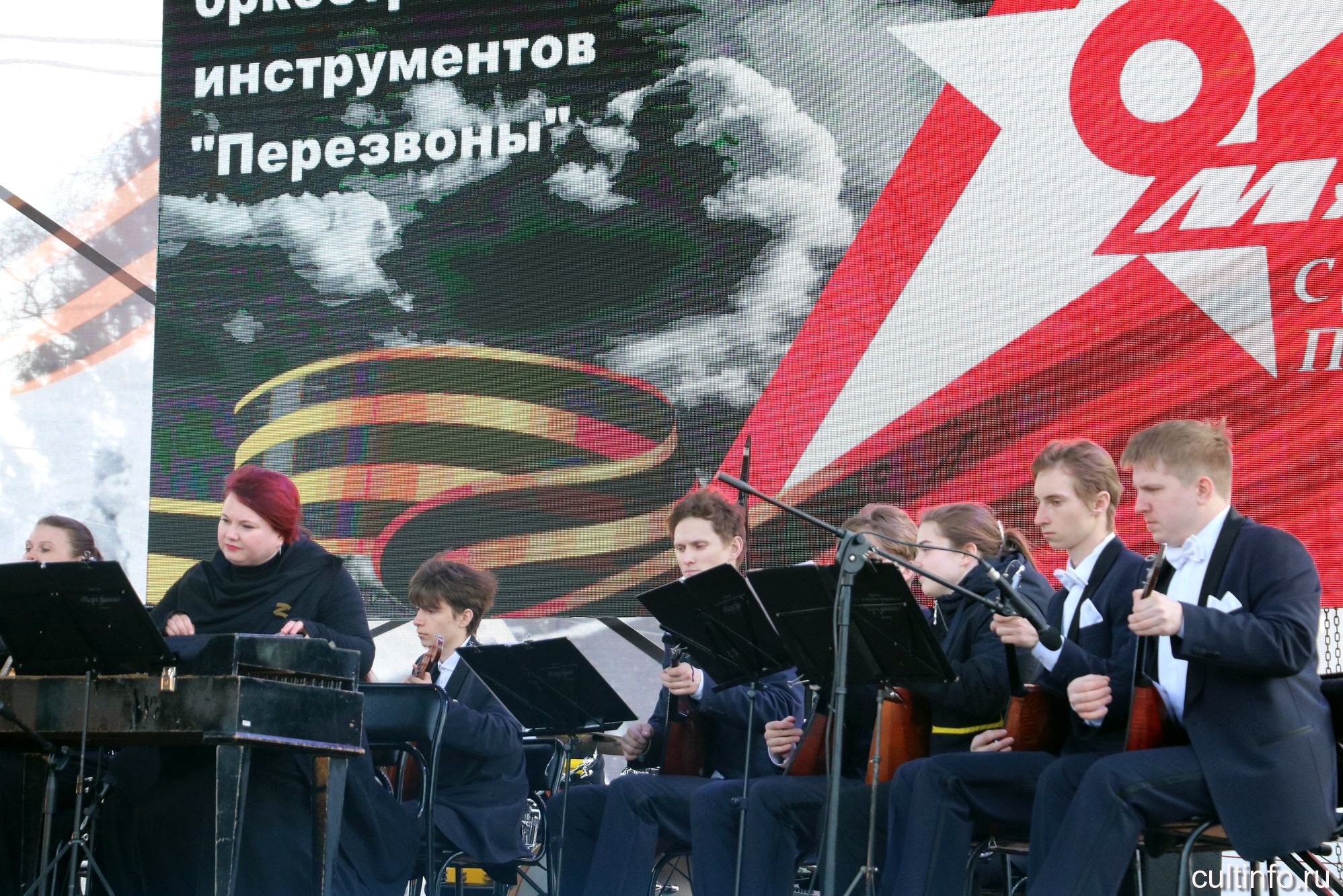 Музыкальную эстафету на площади Революции продолжили оркестр народных инструментов «Перезвоны» под управлением Александра Султаншина и московский исполнитель Максим Щербицкий, представившие программу «Сквозь года звучит Победа».