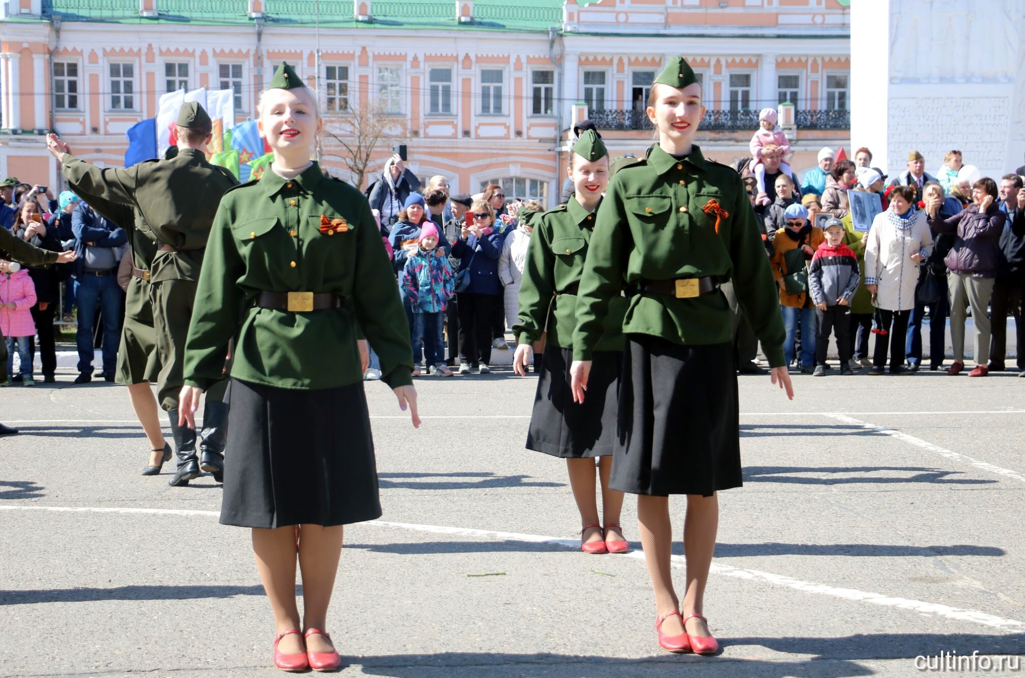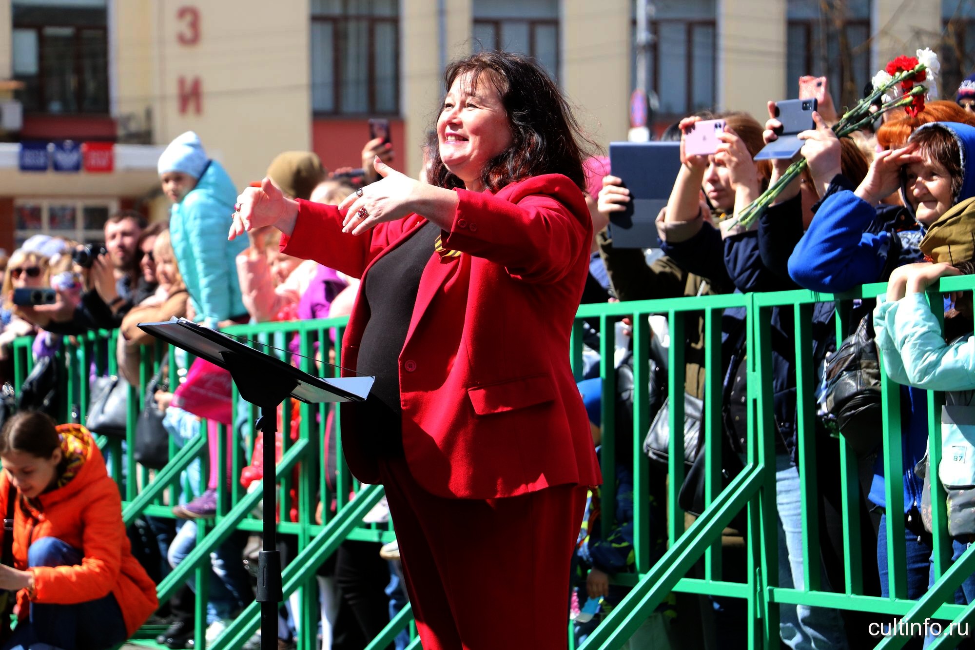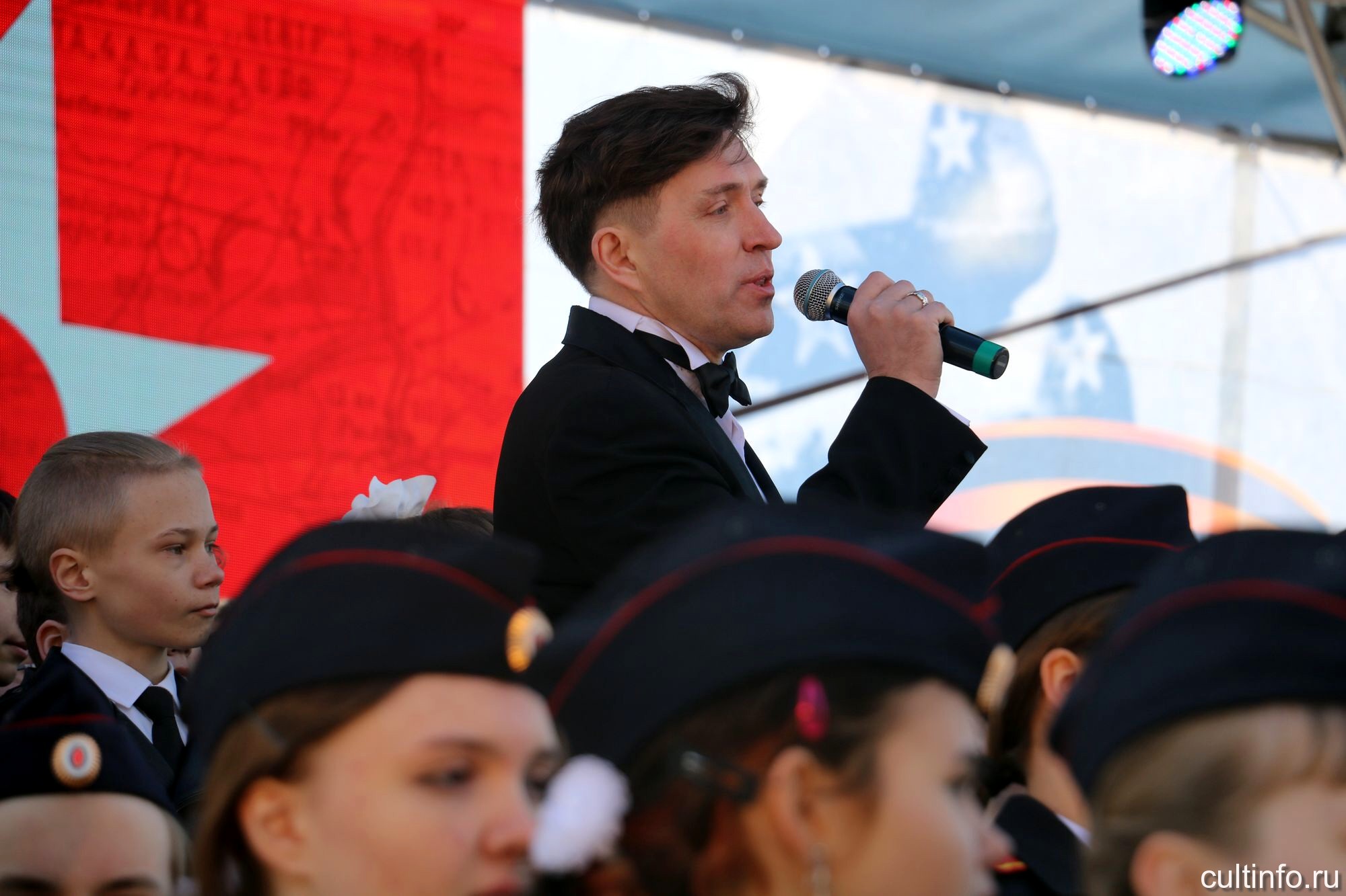 Музыкальную эстафету на площади Революции продолжили оркестр народных инструментов «Перезвоны» под управлением Александра Султаншина и московский исполнитель Максим Щербицкий, представившие программу «Сквозь года звучит Победа».
