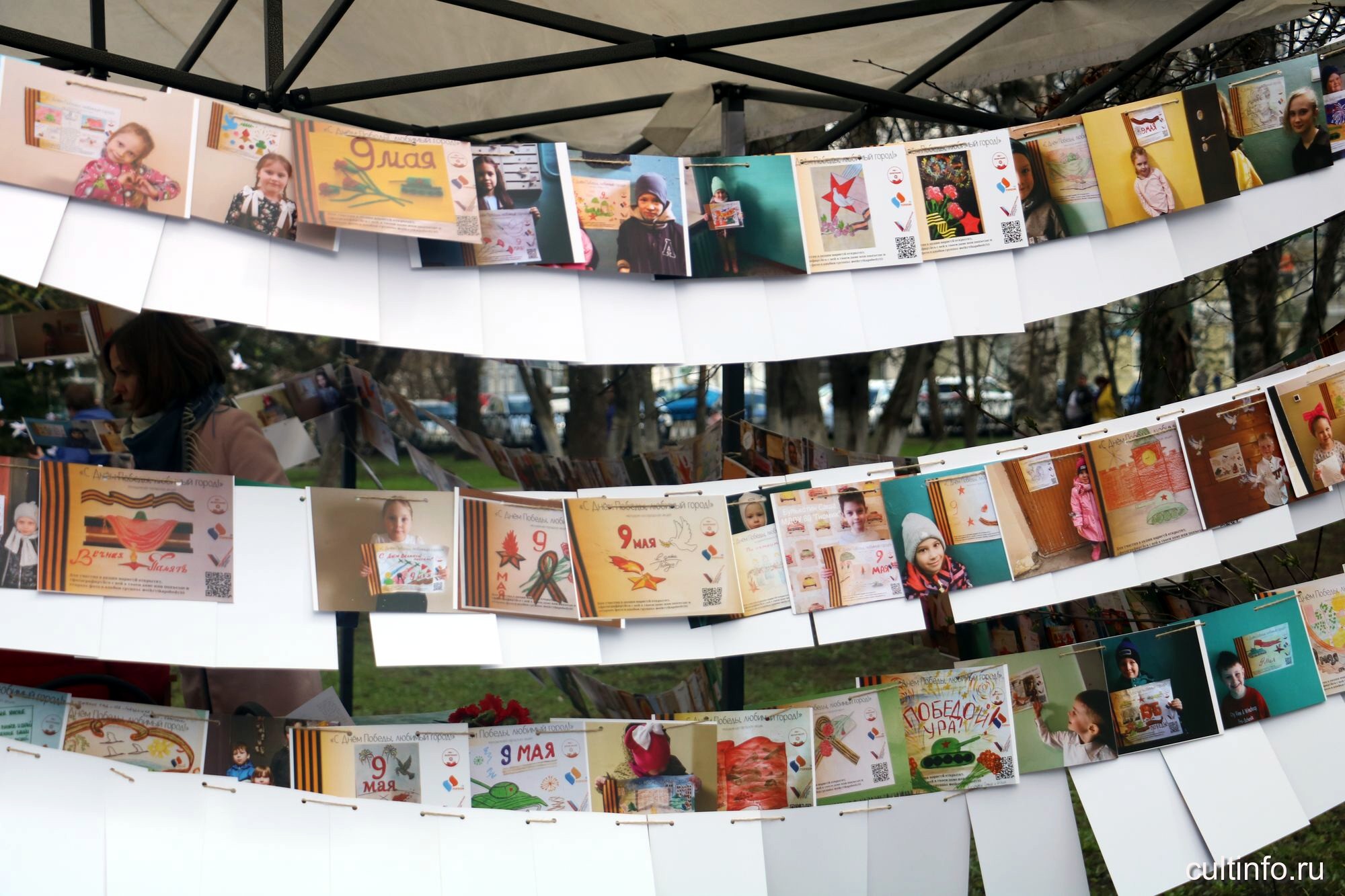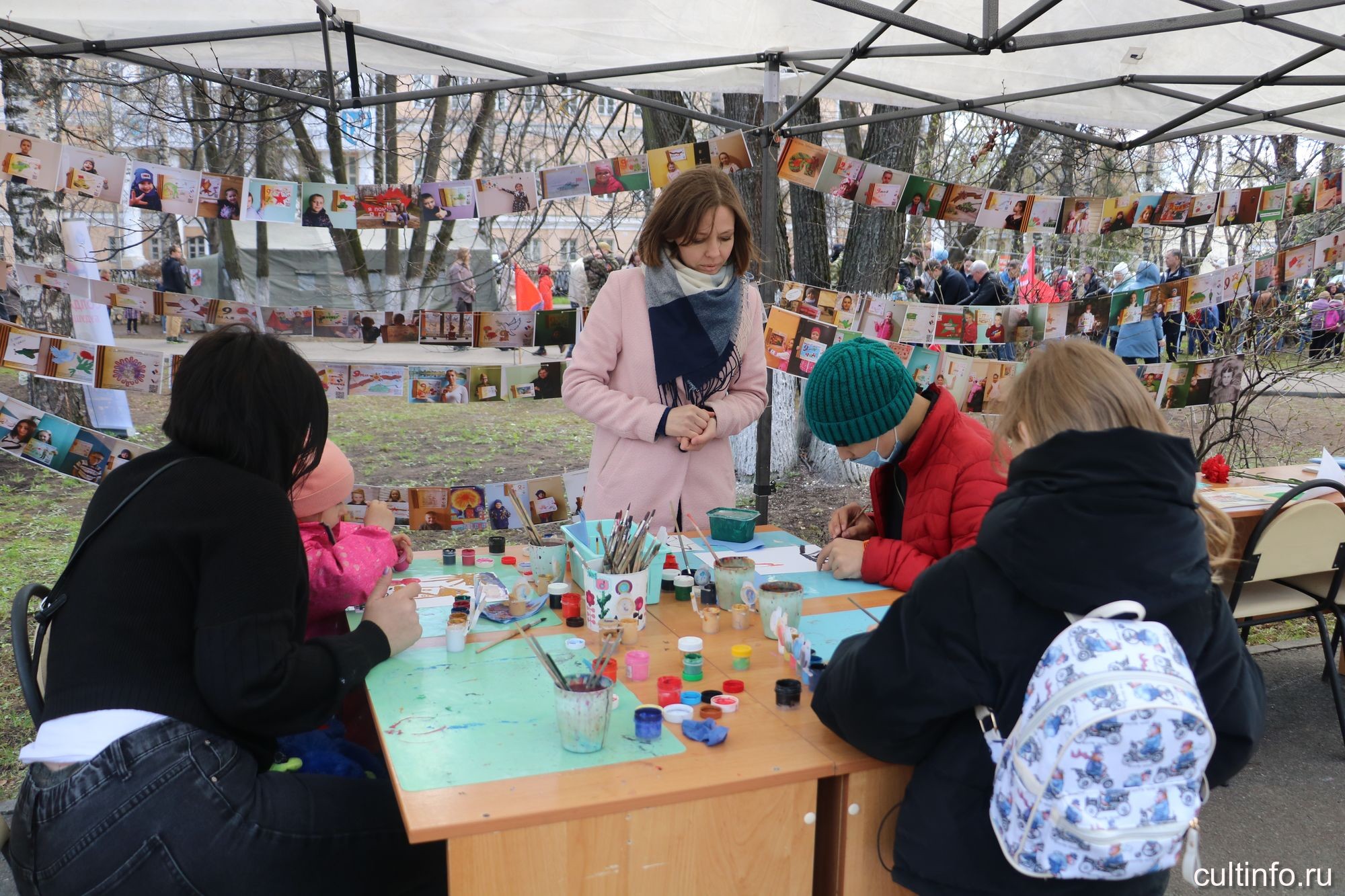 На интерактивных площадках можно сделать бумажного белого голубя – символ мира – и прикрепить его на специальную конструкцию, а также создать свое Знамя Победы с помощью трафарета на красной ткани.
