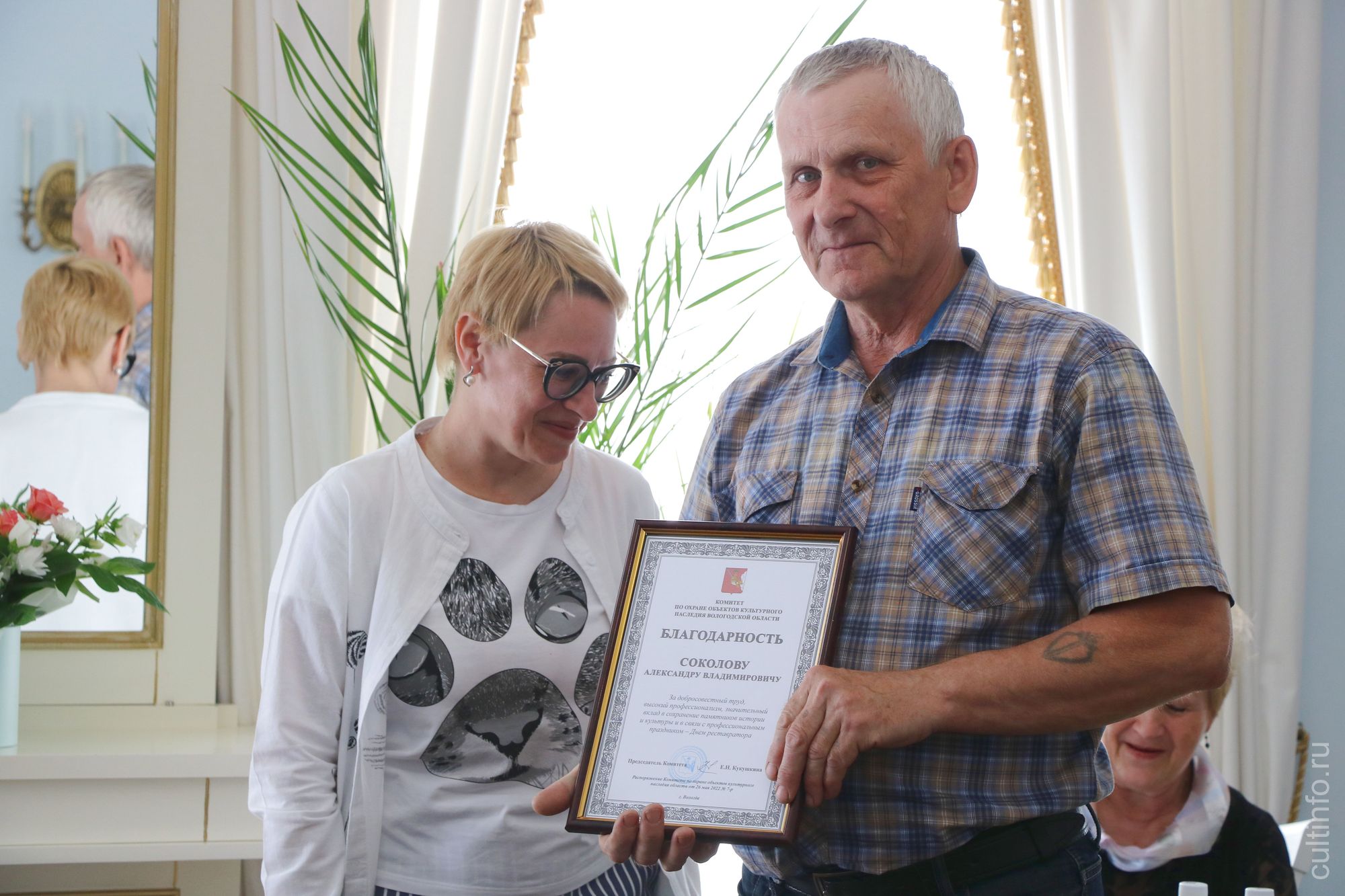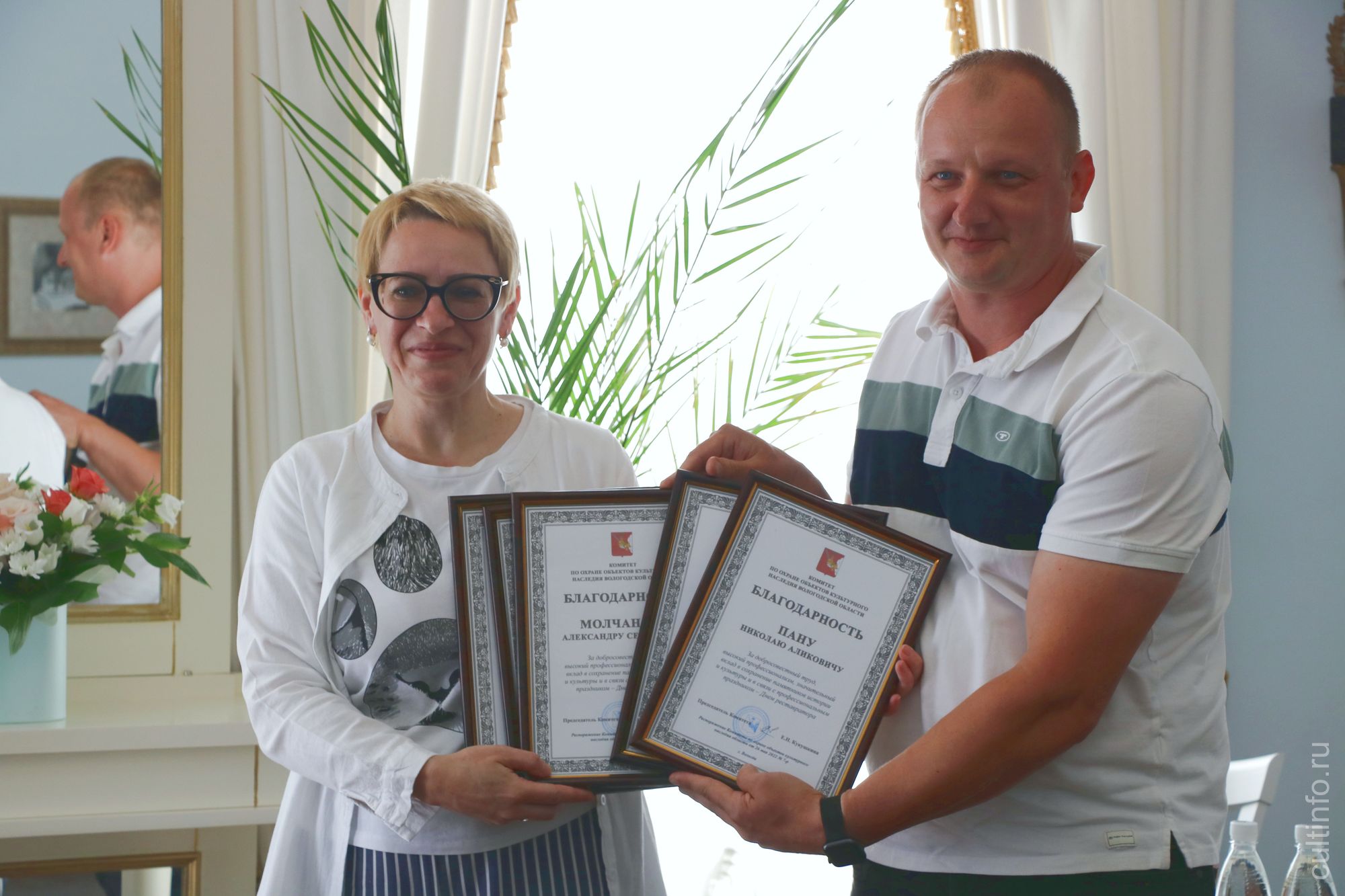 За добросовестный труд, высокий профессионализм и значительный вклад в сохранение истории и культуры в связи с профессиональным праздником Днем реставратора благодарностью комитета также наградили технического директора ООО «Старград» Павла Куваева, на счету которого уже сотни объектов, главного архитектора проекта ООО «Научно-производственные мастерские» Татьяну Глибкину и ряд работников ООО «Вологодские реставраторы».