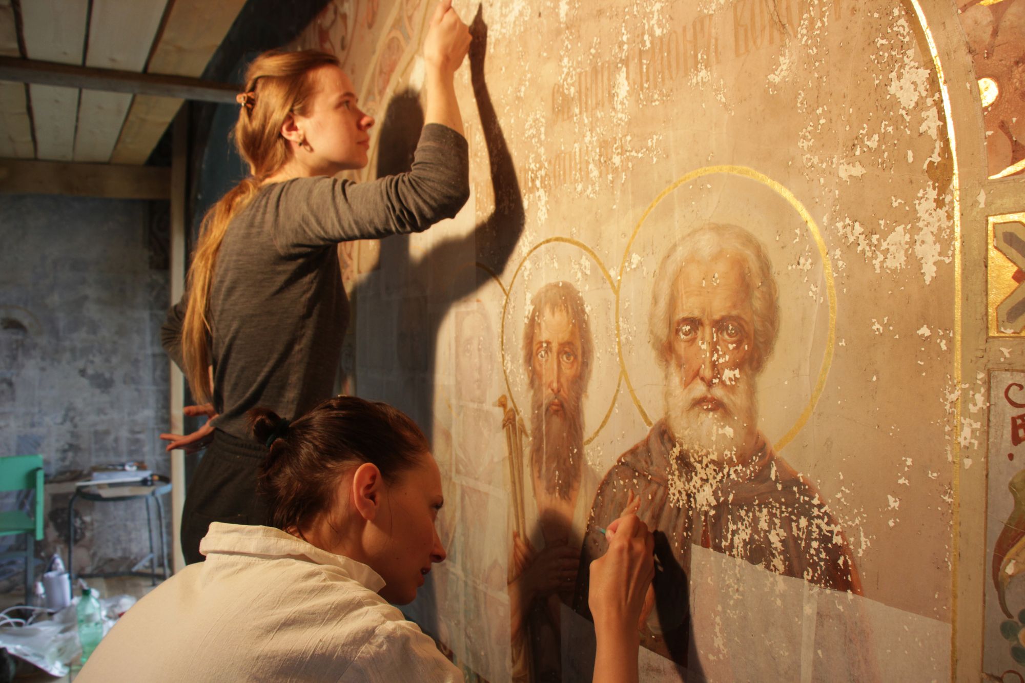 Неожиданная находка ждала реставраторов под перекрытием между этажами. Под полом обнаружились фрагменты росписей со штукатуркой. Есть предположение, что они осыпались, когда взрывали колокольню (по другой версии ее обрушили тракторами). Фрагменты росписи лежали вперемешку с накопившимся за годы мусором: школьными дневниками, мешками, кедами, папиросами и стружкой.