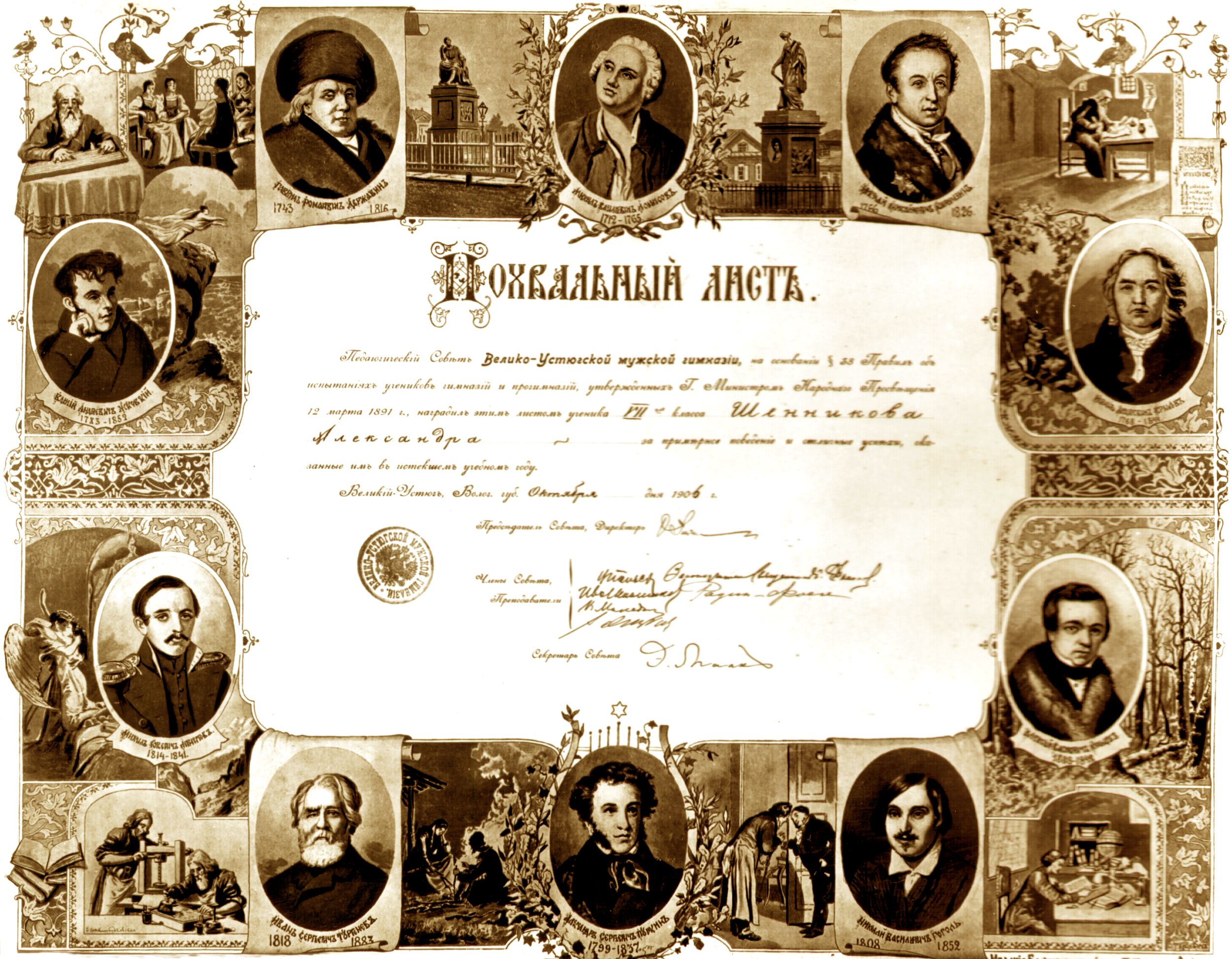 Одним из золотых медалистов Великоустюгской мужской гимназии стал Александр Петрович Шенников, впоследствии известный русский и советский ученый-ботаник, член-корреспондент Академии наук СССР.