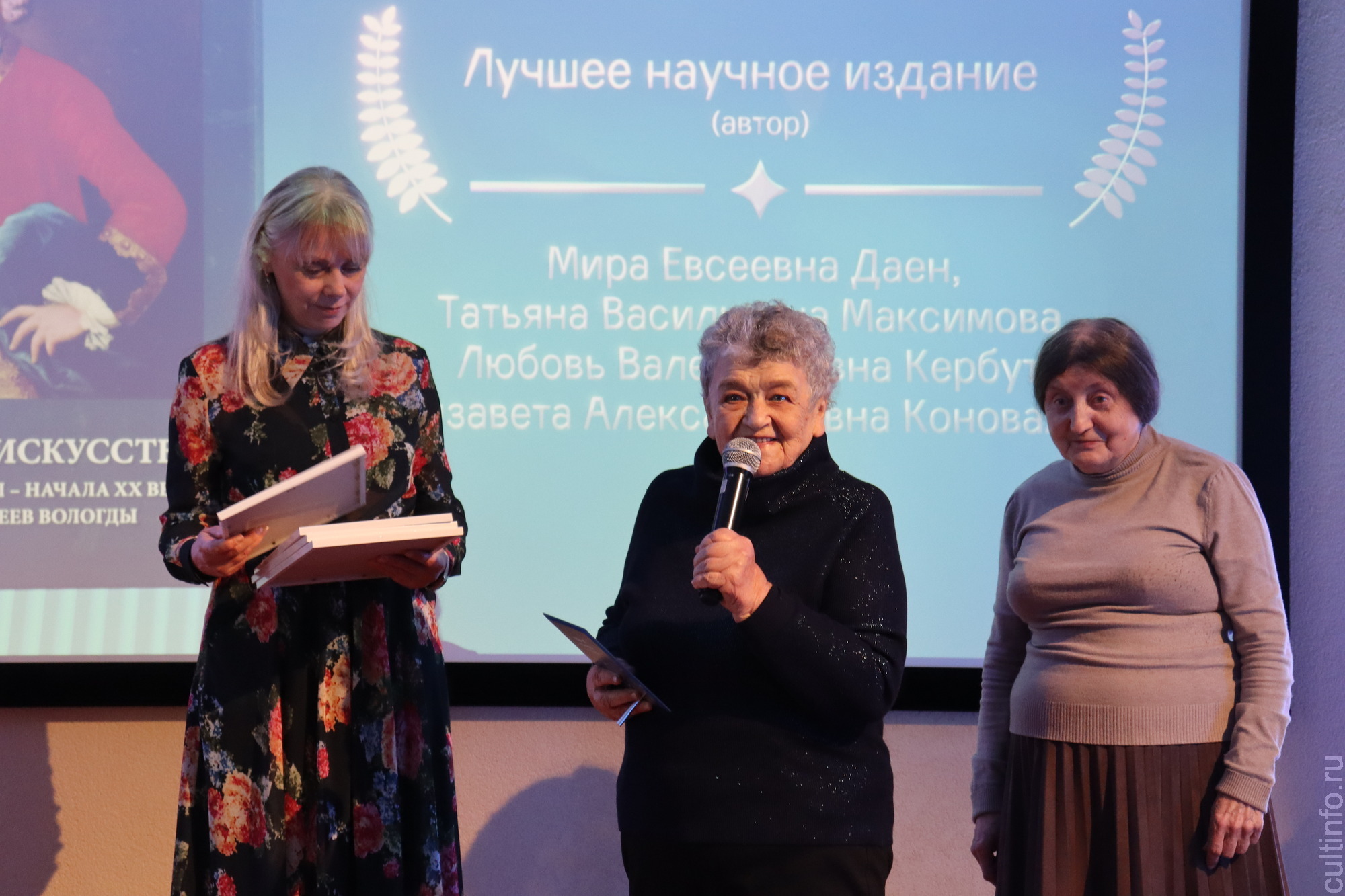 В этом году абсолютным победителем – обладателем звания «Книга книг. Лучшая книга – 2022» – стал научный каталог «Портретное искусство второй половины XVII – начала XX века в собраниях музеев Вологды» под редакцией искусствоведа Миры Даен. Этот монументальный труд охватывает большой круг памятников, возвращенных в научный оборот благодаря современной реставрационной практике. Книга вышла в прошлом году в издательстве «Древности Севера». В нее вошли произведения портретного искусства второй половины XVII – начала XX столетия из двух музейных собраний: Вологодского музея-заповедника и Вологодской областной картинной галереи. Издание каталога осуществлялось при финансовой поддержке Российского фонда фундаментальных исследований. Тираж поступил во все ведущие библиотеки страны по списку фонда. Кроме того, на конкурсе издание «Портретное искусство второй половины XVII – начала XX века в собраниях музеев Вологды» стало победителем в номинации «Лучшее научное издание (автор)». В коллективе авторов – Мира Даен, Татьяна Максимова, Любовь Кербут, Елизавета Коновалова.