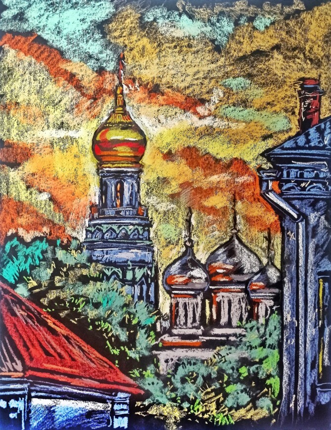 «У людей этот материал ассоциируется с чем-то нежным, размытым. Но нужно удивлять, а не идти проторенным путем. И я шел от обратного: брал тонированную, темную бумагу (в основном черная, темно-синяя, или коричневая). Это усложняет задачу, так как здесь не сделать набросков – нужно сразу понимать, что и где будет расположено, писать начисто. Начинал в этой технике с цветов, натюрмортов и пейзажей. Потом в Центре ремесел предложили создать пастельную серию, посвященную Софийскому собору. Сначала побаивался, потому что не писал архитектурные памятники в этой технике, но одна, вторая работа, и дело пошло», – поделился Олег Малинин.