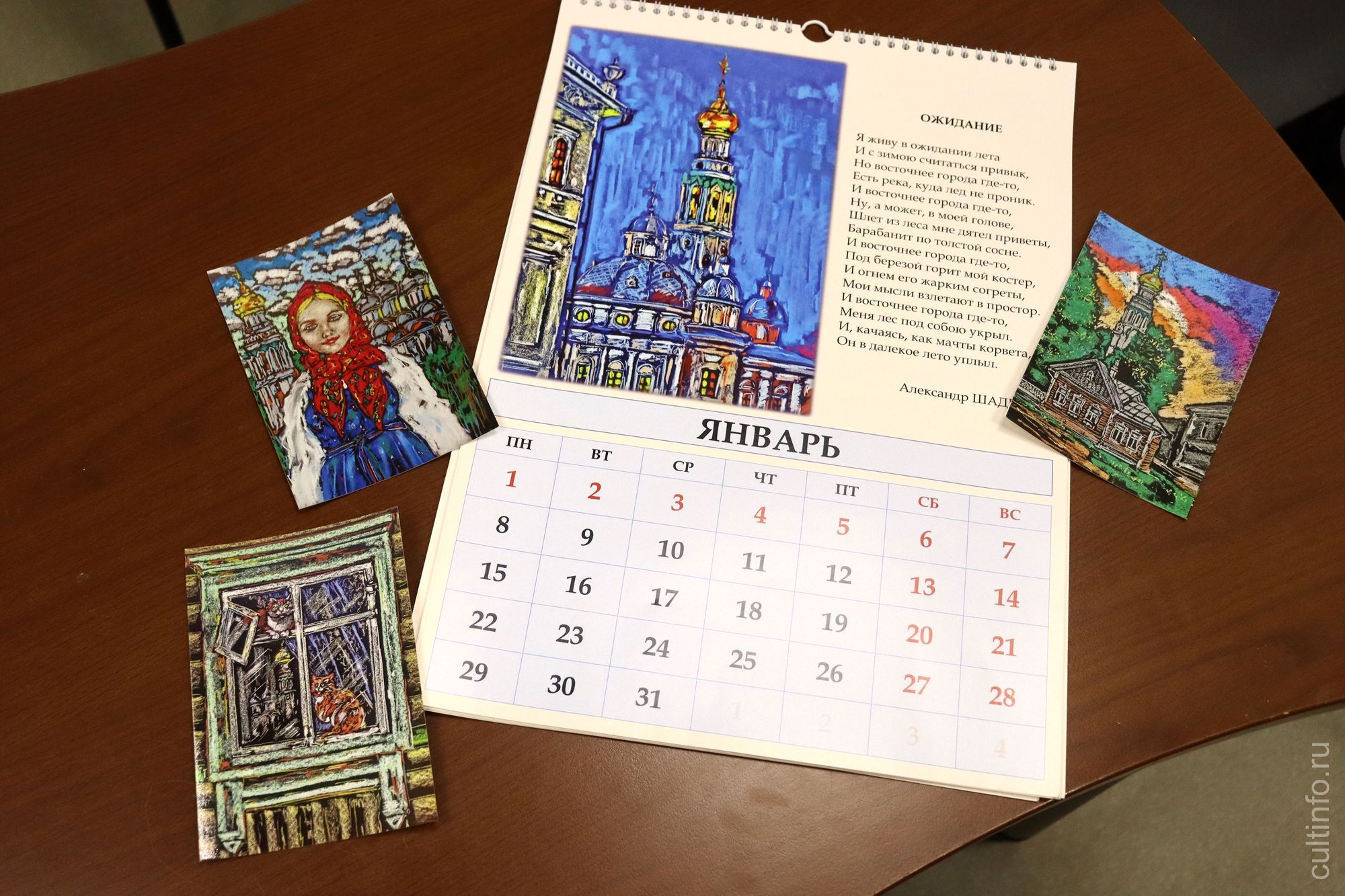 Для календаря серия была дополнена еще четырьмя работами: 12 месяцев плюс обложка, на которой представлен собирательный образ вологжанки. Картины сопровождаются стихотворениями вологодских поэтов Николая Рубцова, Александра Яшина, Варлама Шаламова, Татьяны Петуховой и других. Подбором произведений занимались сотрудники Юношеского центра им. В.Ф. Тендрякова Ольга Халявина и Денис Абросимов, который также отвечал за верстку и дизайн календаря.