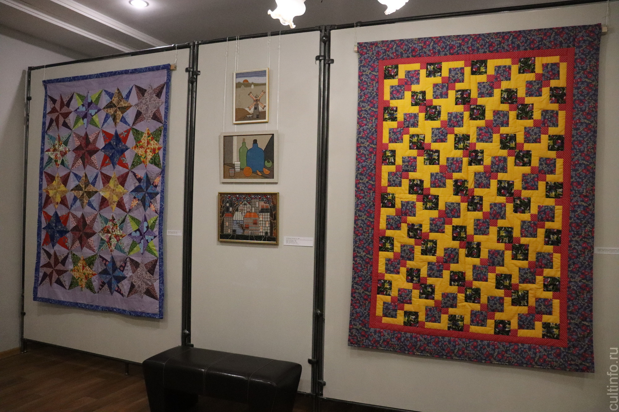 Яркий тон экспозиции «Рукотворное чудо» задают масштабные работы в технике лоскутного шитья. Это изделия двух известных творческих клубов в Вологде «Горница» и «Лепота».