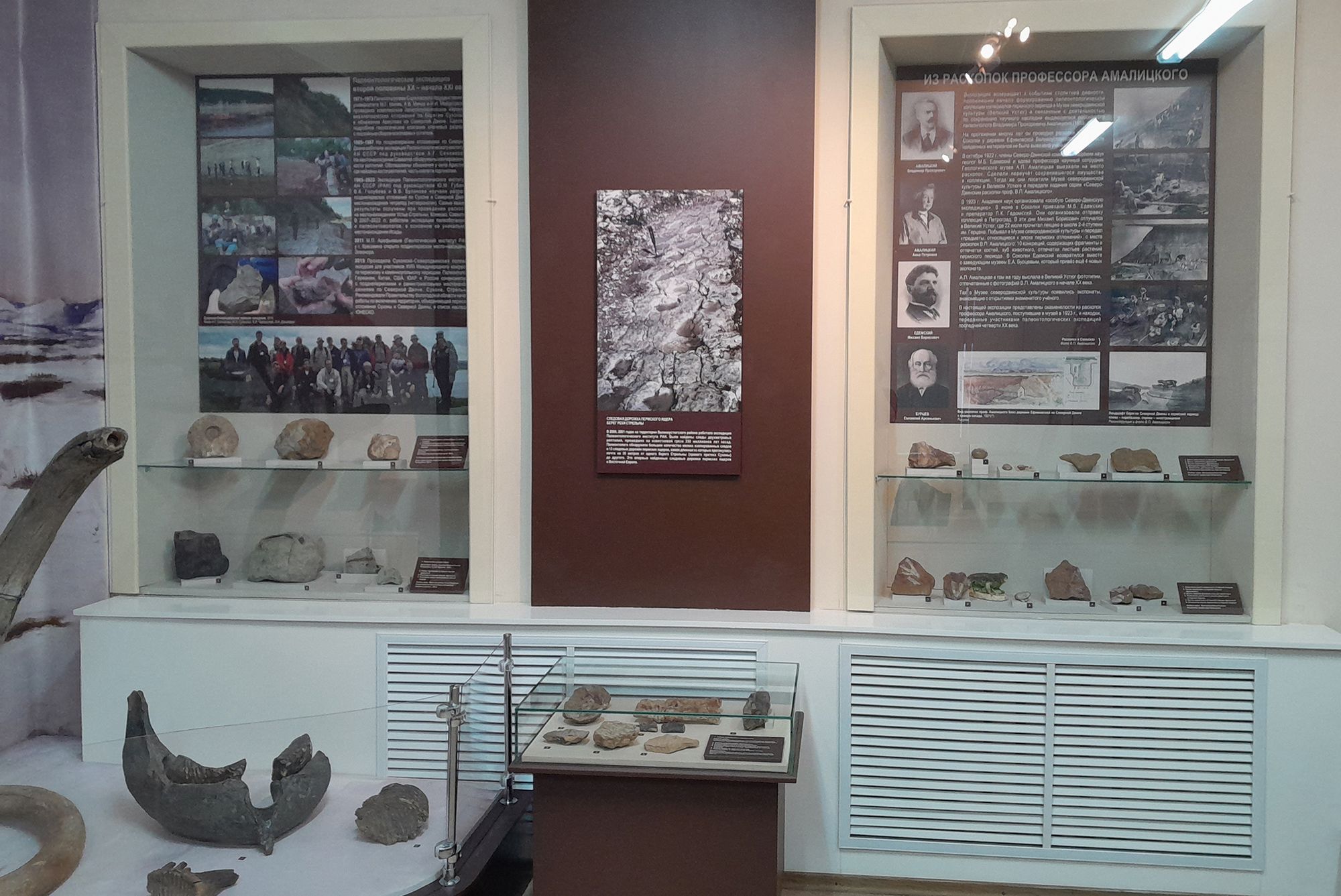 На выставке представлены окаменелости из раскопок В. П. Амалицкого. Они содержат фрагменты и отпечатки костей, зубы древних животных, отпечатки листьев растений пермского периода. В 1923 году члены Северо-Двинской комиссии Академии наук геолог М. Б. Едемский и вдова профессора, научный сотрудник Геологического музея А. П. Амалицкая передали в Музей северодвинской культуры в Великом Устюге окаменелости «из раскопок профессора Амалицкого», а также фототипии, отпечатанные с фотографий профессора в начале XX века. Тогда же заведующий музеем Е. А. Бурцев сам выезжал на место раскопок. Так в великоустюгском музее появились экспонаты, знакомящие с открытиями знаменитого ученого.