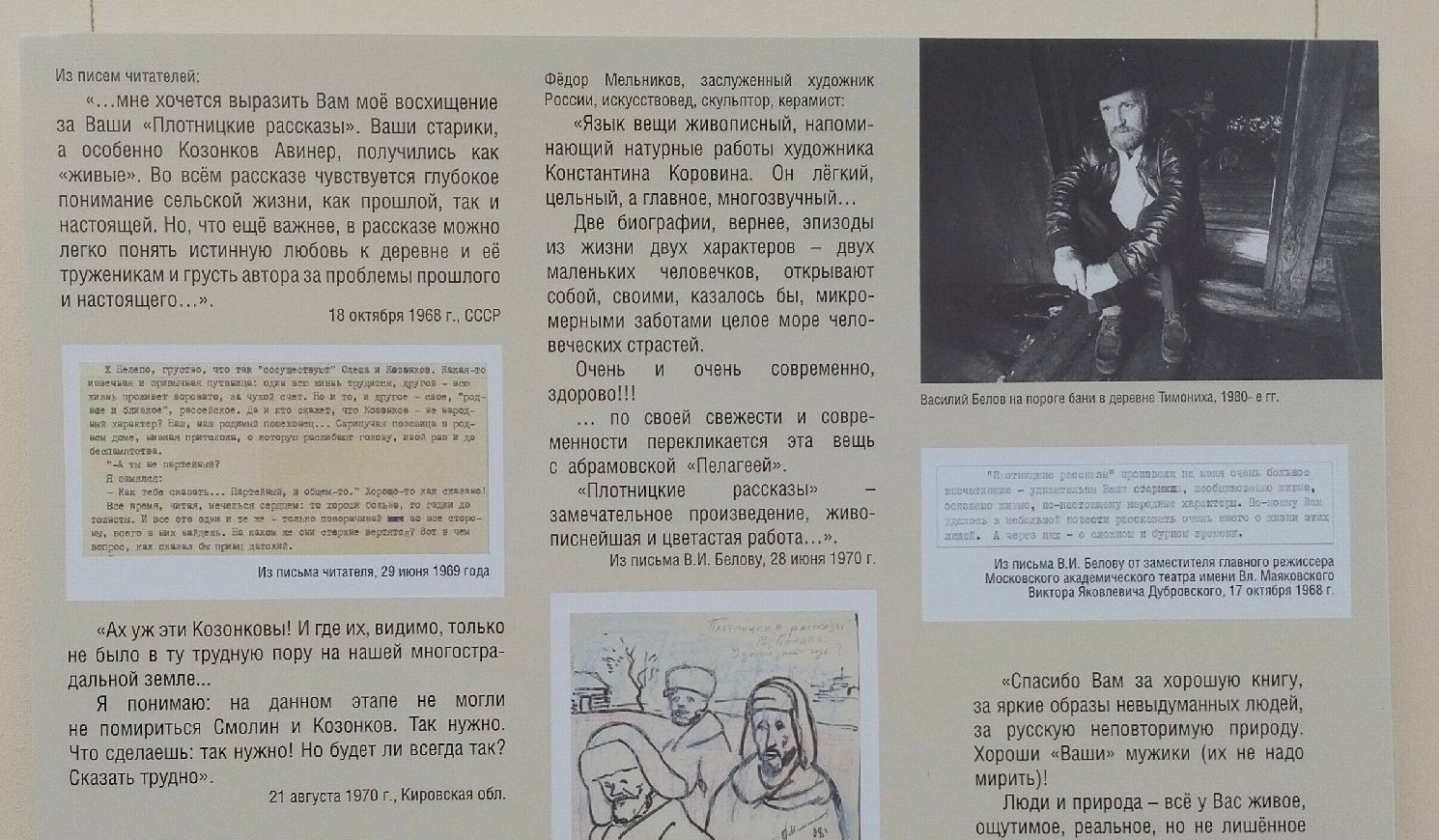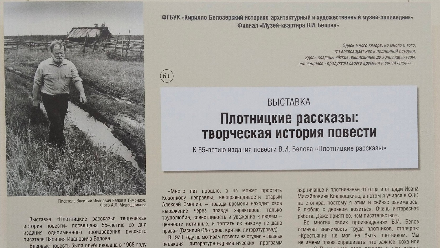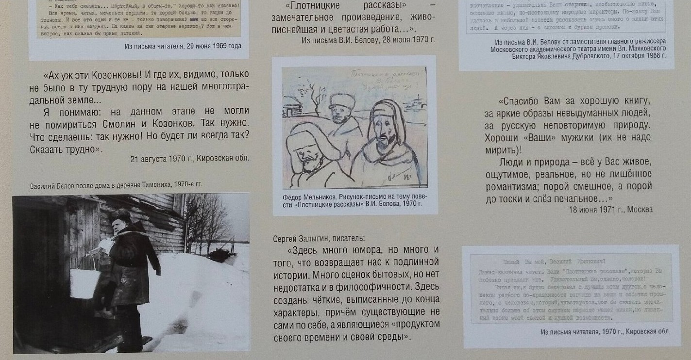 Выставка знакомит с историей создания и публикации повести Василия Белова «Плотницкие рассказы», открывает материалы «творческой лаборатории» писателя, представляет читательские отклики и мнения критиков о произведении.