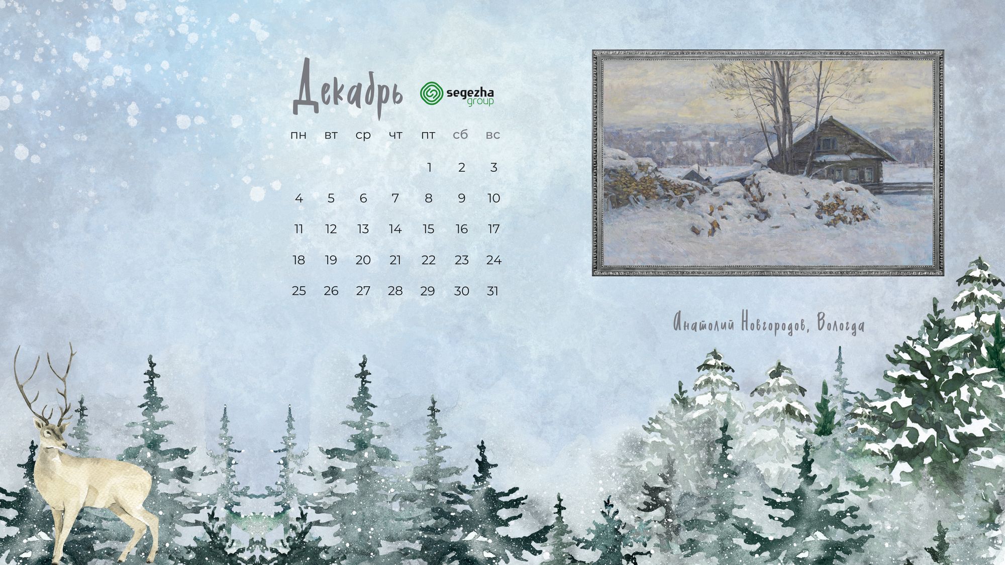 Картина вологодского художника Анатолия Новгородова «Зимний вечер» выбрана главной темой этого декабря в виртуальном корпоративном календаре Segezha Group (MOEX: SGZH, входит в АФК «Система»).