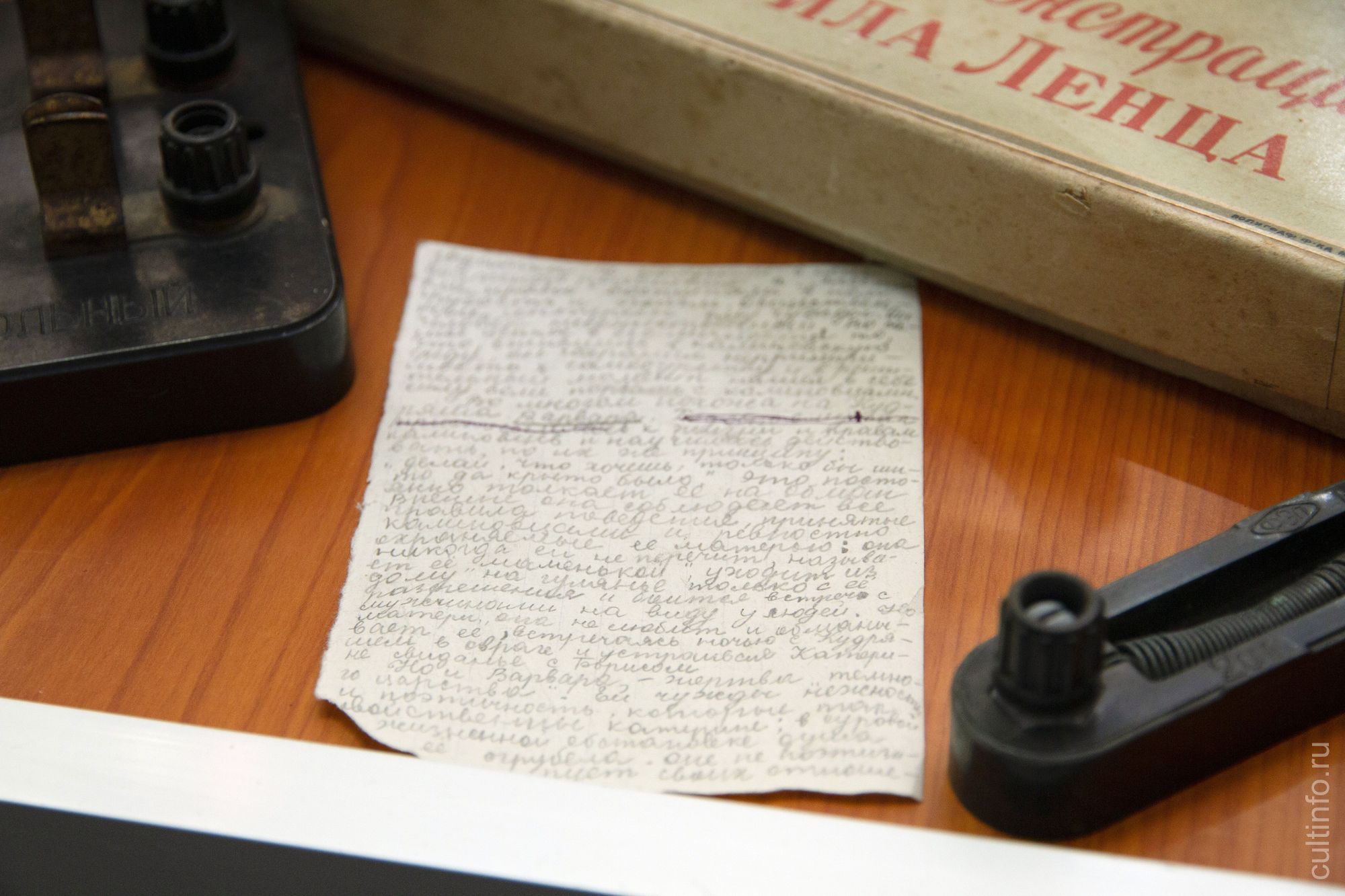 Одна из тетрадей, выставленных в витрине, привезена из блокадного Ленинграда.