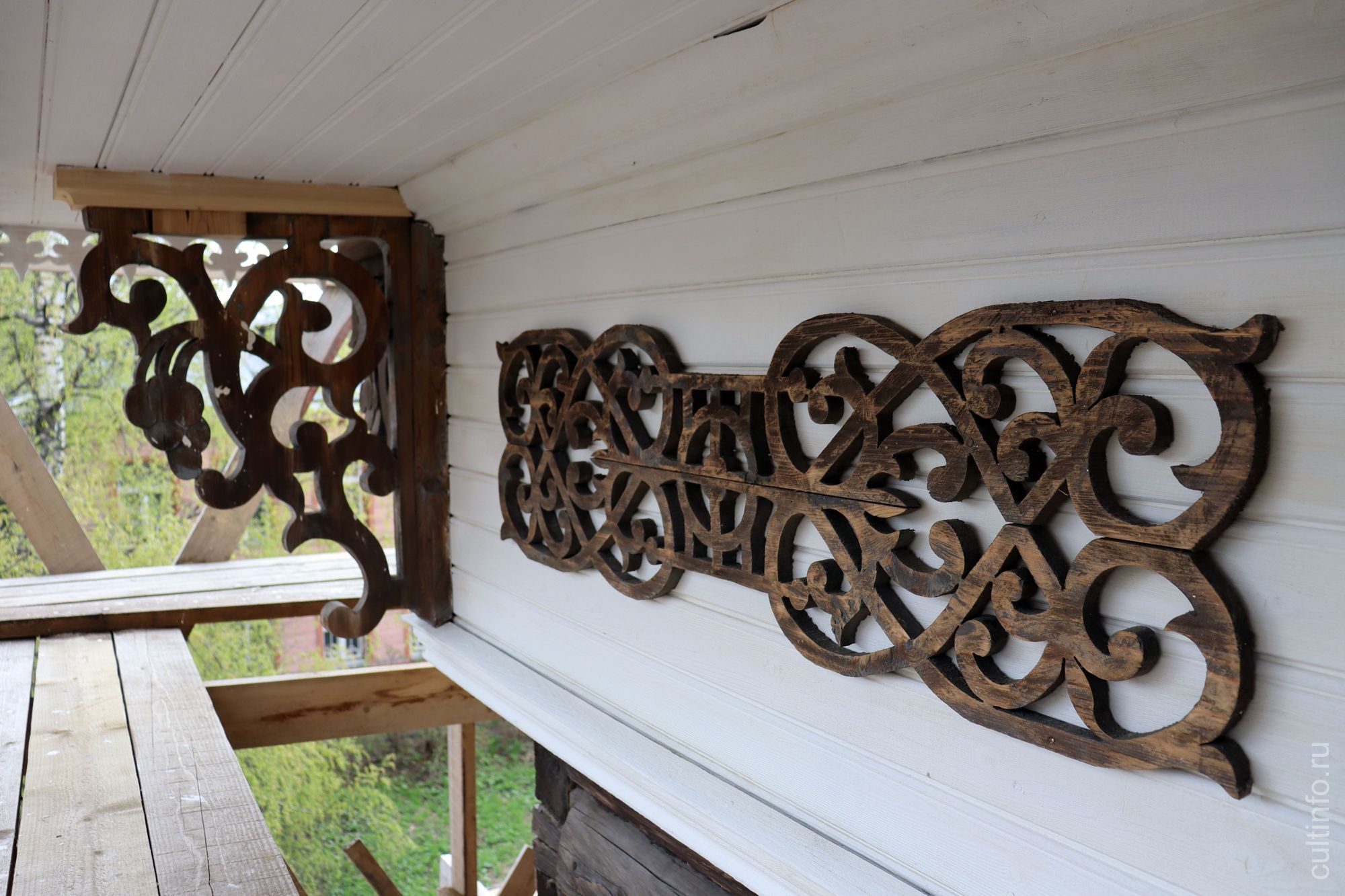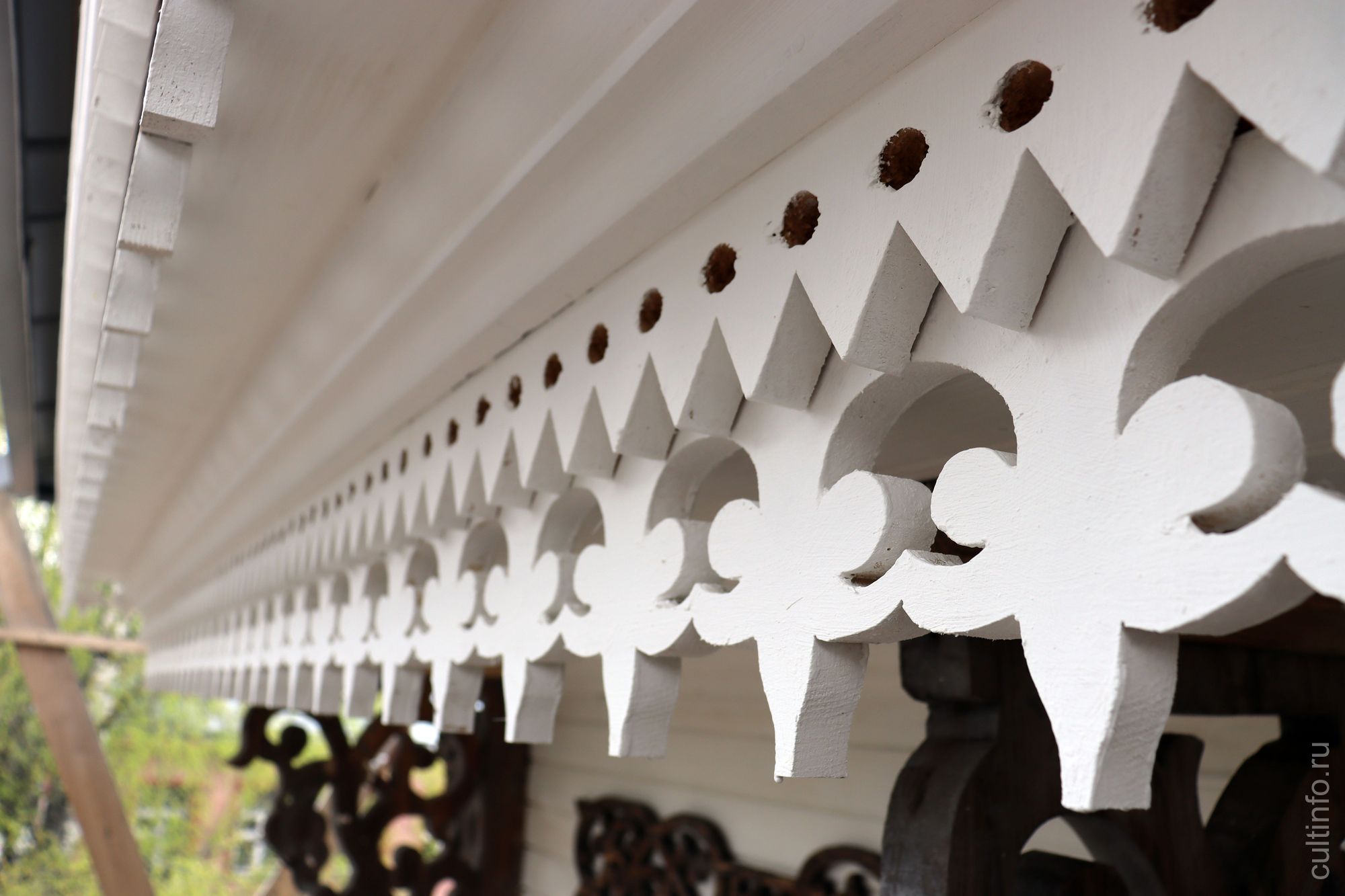 Пока позволяет погода, специалисты занимаются покрасочными работами: белый цвет приобретают карнизы и парадное крыльцо. Часть резных деталей останутся не окрашенными. Такое решение предложил главный архитектор проекта Владимир Лукин, чтобы подчеркнуть подлинные элементы декора и их «возраст».